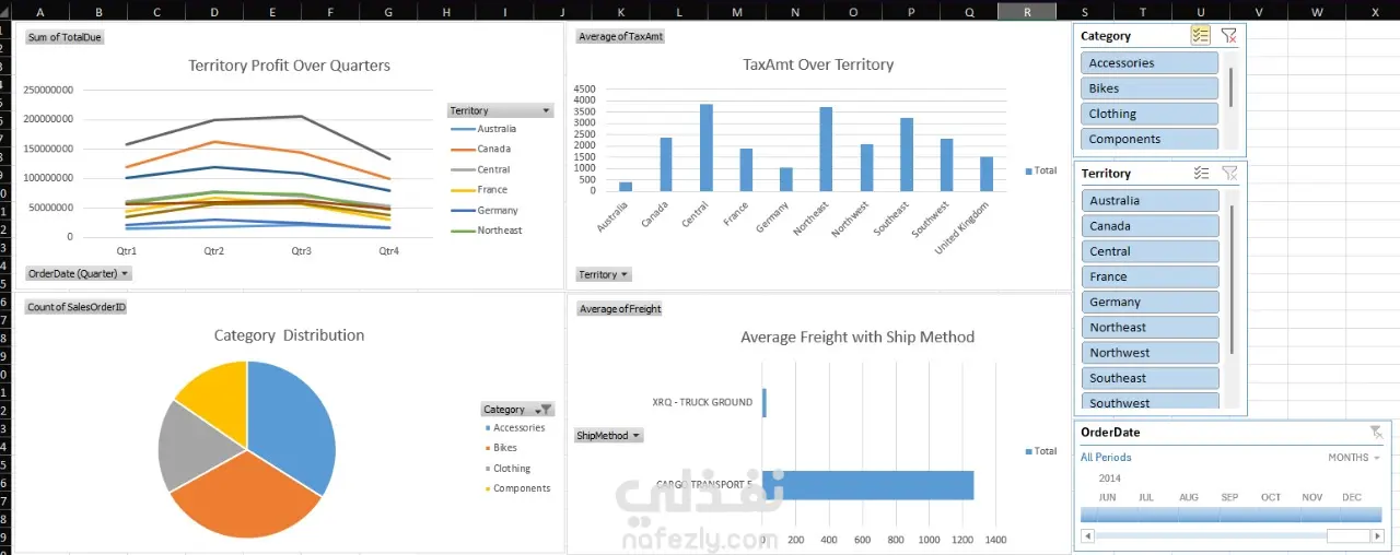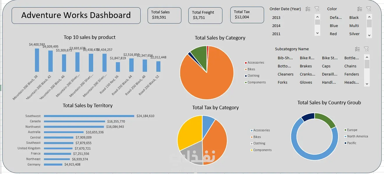لوحة تحكم تفاعلية لتحليل المبيعات باستخدام Excel، توضح أهم مؤشرات الأداء مثل إجمالي المبيعات، الأرباح، والضرائب، بالإضافة إلى توزيع المبيعات حسب الفئات والمناطق الجغرافية. التصميم يساعد على استخراج رؤى واضحة لاتخاذ قرارات أفضل.