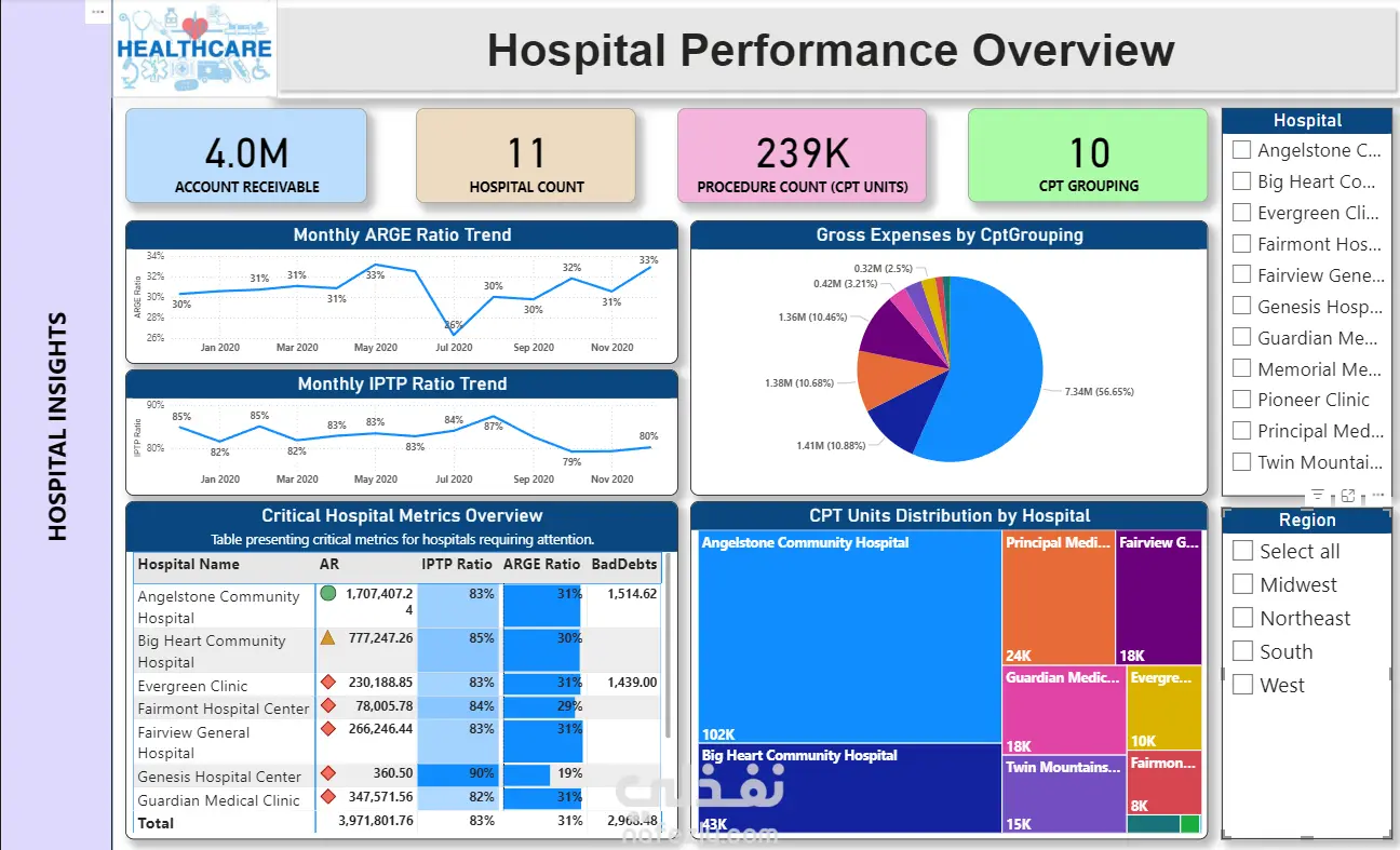 تم تنفيذ مجموعة متكاملة من لوحات المتابعة (Dashboards) لقطاع الرعاية الصحية، تشمل المستشفيات، مقدّمي الخدمة، والمرضى، باستخدام أدوات تحليل البيانات المتقدمة مثل Microsoft Power BI وExcel. تم تصميم هذه اللوحات بأسلوب تنفيذي احترافي يساعد على تتبّع الأداء المالي والتشغيلي والطبي بشكل لحظي، ويتيح لصنّاع القرار رؤية شاملة لمختلف جوانب القطاع. تتضمن اللوحات ما يلي: لوحة نظرة عامة على أداء المستشفيات: تتضمن مؤشرات الحسابات المستحقة، عدد المستشفيات، حجم الإجراءات الطبية، نسب الأداء الشهري، وتوزيع الوحدات حسب المستشفيات. لوحة الملخص التنفيذي المالي: تُظهر اتجاه المصروفات الشهرية، الإيرادات من التأمين والمرضى، حجم الإجراءات، نمو المرضى، وأداء الدفع الشهري مع مقارنات بالأهداف الموضوعة. لوحة مؤشرات مقدّمي الخدمة: تحليل شامل لعدد الأطباء حسب المناطق، توزيع التخصصات، حجم وحدات CPT، وعدد الموظفين بدوام كامل، مع مصفوفة أداء متخصصة للمجالات الطبية المختلفة. لوحة نتائج المرضى: تعرض توزيع المرضى حسب العادات الصحية (التدخين، ممارسة الرياضة، النظام الغذائي...)، والفصائل الدموية، بالإضافة إلى خريطة تفاعلية توضّح توزيع المرضى على مستوى الولايات والمدن. مميزات العمل: تصميم عصري وواضح مناسب للعروض التنفيذية والاجتماعات القيادية. استخدام فلاتر تفاعلية متقدمة لتمكين المستخدم من تحليل البيانات حسب المنطقة أو المستشفى أو نوع الدافع (تأمين/مرضى). دمج المؤشرات المالية مع البيانات الطبية في واجهة واحدة تسهّل اتخاذ القرار. عرض الاتجاهات الزمنية وتحليل الأداء مقارنة بالأهداف الموضو