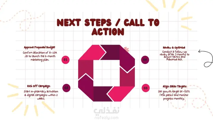 “قمت بإعداد وتصميم عرض تقديمي متكامل لخطة تسويقية خاصة بمكمل غذائي (Mucofight) لصالح أحد مصانع الأدوية. العرض شمل جميع العناصر الأساسية لعرض استراتيجي تسويقي: • تحليل السوق وتحديد المشكلات والفرص. • تقديم نظرة شاملة عن المنتج ومكوناته وفوائده. • مقارنة المنتج بالمنافسين مع إبراز نقاط القوة التنافسية. • بناء سيناريوهات للنمو المتوقع وخطط المبيعات. • وضع خطة ميزانية وتوزيع الحملات على مراحل (Awareness – Engagement – Conversion – Optimization). • تحديد الخطوات القادمة (Call to Action) لبدء التنفيذ. تم تصميم العرض بأسلوب بصري جذاب، مع استخدام الألوان والأيقونات والرسوم البيانية لإيصال المعلومة بشكل مبسط واحترافي. تم تسليم العرض بصيغة PowerPoint قابلة للتعديل، بالإضافة إلى نسخة PDF جاهزة للعرض أمام الإدارة.”