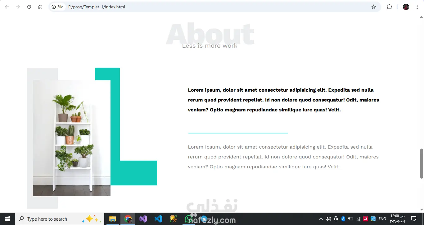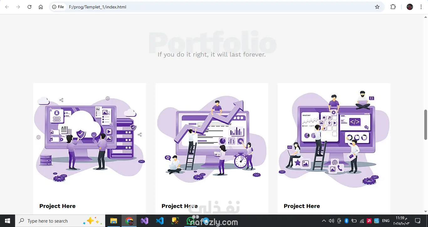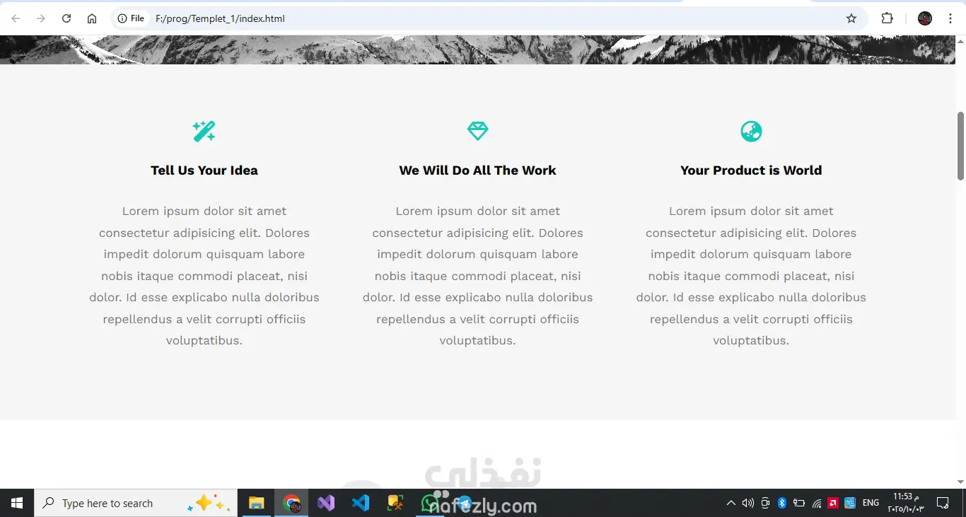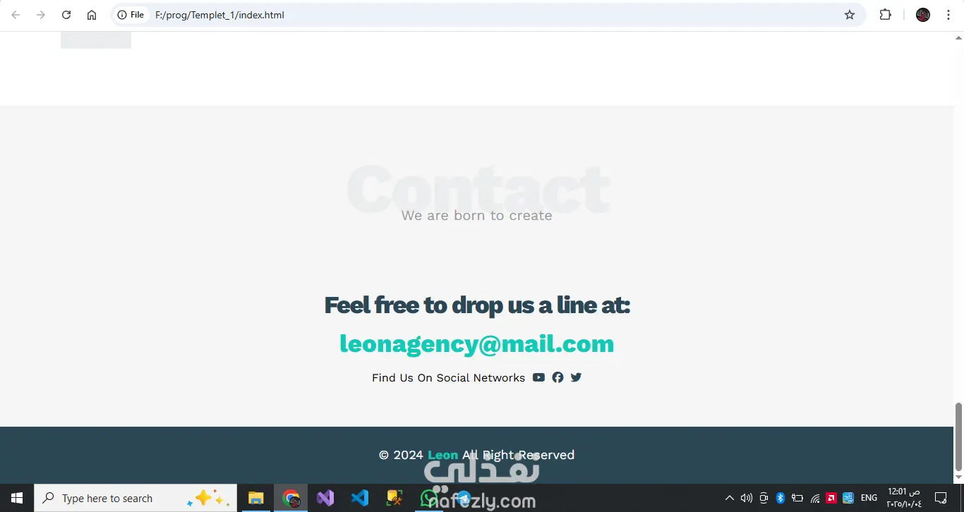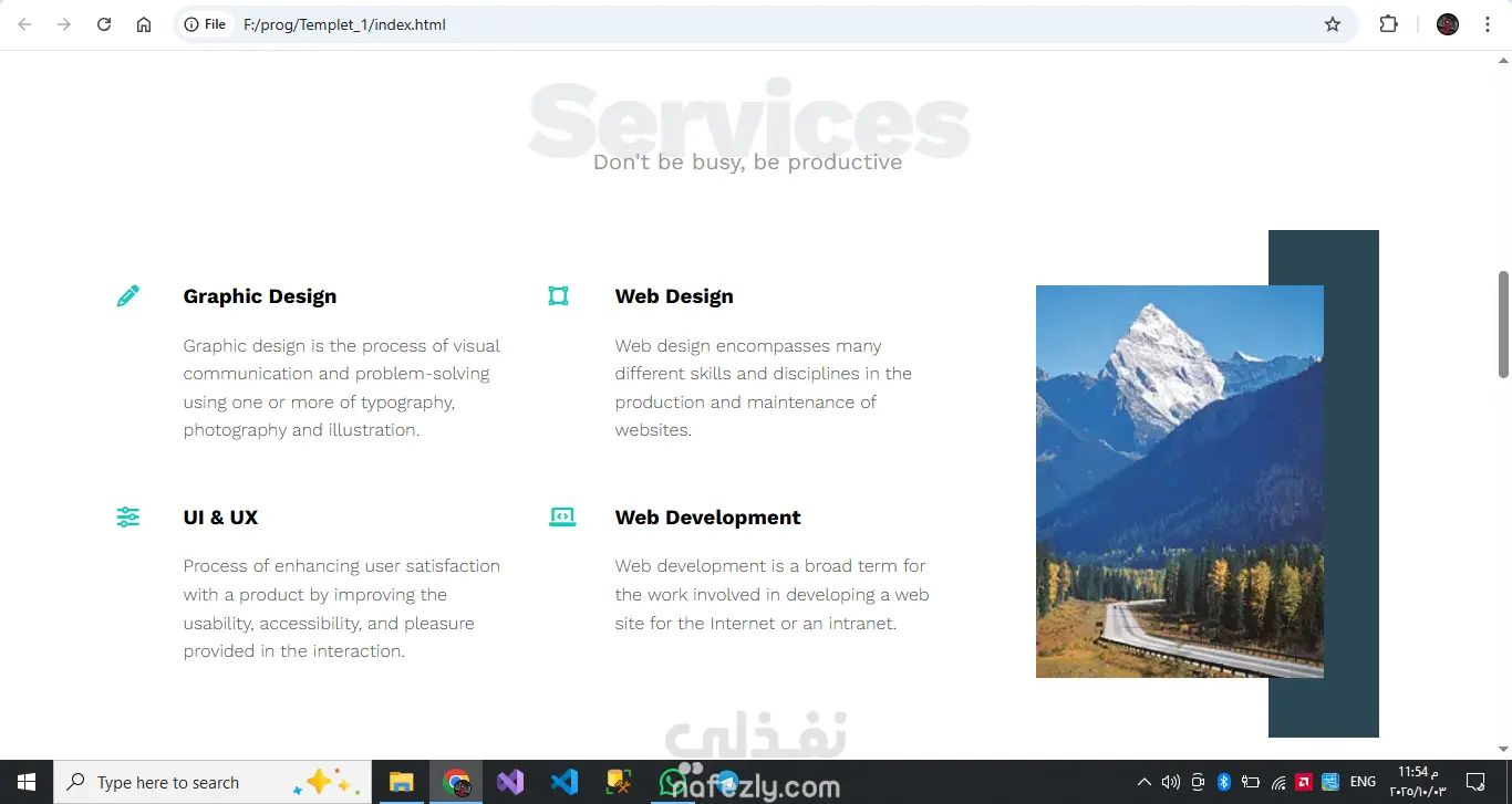 تصميم بسيط باستخدام HTML & CSS مكون من 6 اقسام لعرض ترحيب و عرض معلومات مثل الخدمات و المشاريع السابقه و طرق التواصل A simple design using HTML & CSS consisting of 6 sections to display a welcome message, information such as services, previous projects, and contact methods.