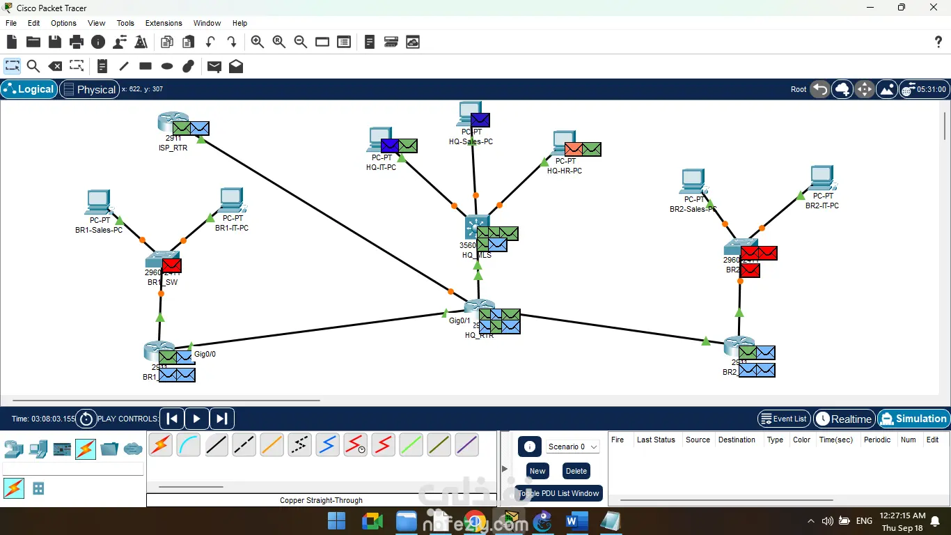 نفذت مشروع عملي لتصميم شبكة متكاملة لمؤسسة تضم مقر رئيسي (HQ) وفرعين (Branch1 و Branch2). تم بناء التوبولوجي باستخدام 1 Router + 1 Multi-Layer Switch + PCs في المقر الرئيسي، مع 1 Router + 1 Switch + PCs لكل فرع. كما تم توصيل المقر الرئيسي بالإنترنت عبر راوتر الـ HQ. المشروع شمل: إنشاء VLANs لتقسيم الأقسام (Sales – IT – HR) في المقر الرئيسي، وربطها مع الفروع. تنفيذ Inter-VLAN Routing على الـ Multi-Layer Switch لتمكين الاتصال بين VLANs. استخدام بروتوكول OSPF لربط المقر الرئيسي بالفروع وتبادل الشبكات عبر Area 0. إعداد NAT Overload (PAT) على راوتر المقر الرئيسي لإتاحة اتصال الأجهزة بالإنترنت. تطبيق Access-Lists لتقييد الوصول: منع قسم HR من الإنترنت، ومنع قسم IT بفرع 2 من الوصول لقسم Sales بالمقر. المخرجات: تصميم توبولوجي يوضح المقر الرئيسي والفروع والاتصال بالإنترنت. تكوين VLANs وInter-VLAN Routing بشكل عملي. تشغيل OSPF وربط الشبكات الفرعية. إعداد NAT لتوفير وصول آمن وفعال للإنترنت. تطبيق ACLs لضبط سياسات الأمان والتحكم في الوصول. القيمة المضافة: المشروع يبرز مهاراتي في تصميم وتنفيذ شبكة مؤسسية متكاملة باستخدام Packet Tracer، مع تطبيق مفاهيم متقدمة (VLANs, OSPF, NAT, ACLs) بشكل منظم. كما قمت بتوثيق جميع الخطوات والتأكد من كفاءة الشبكة من خلال اختبارات اتصال شاملة.