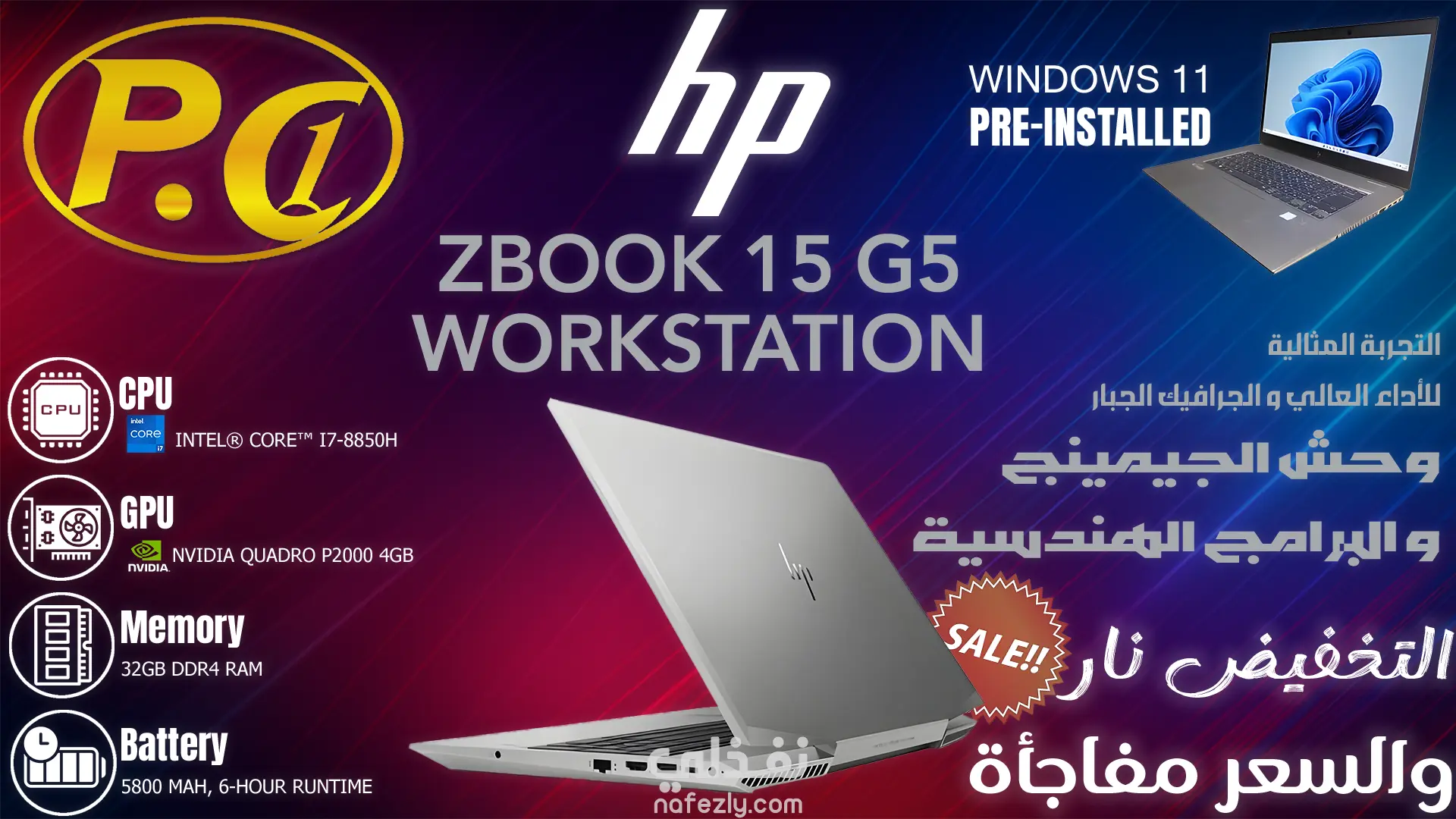 هذا تصميم إعلاني مخصص للترويج لجهاز ZBook 15 G5 Workstation Laptop، يبرز فيه صورة اللابتوب بشكل احترافي مع عناصر جرافيكية تضيف جاذبية للإعلان.