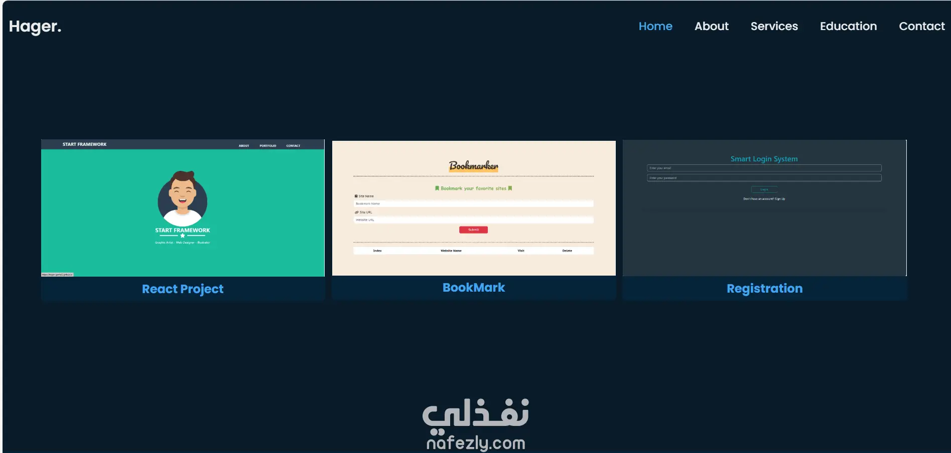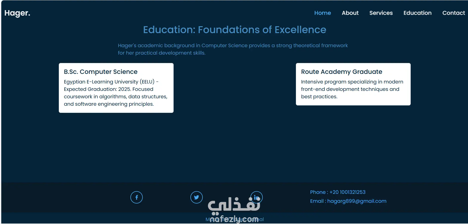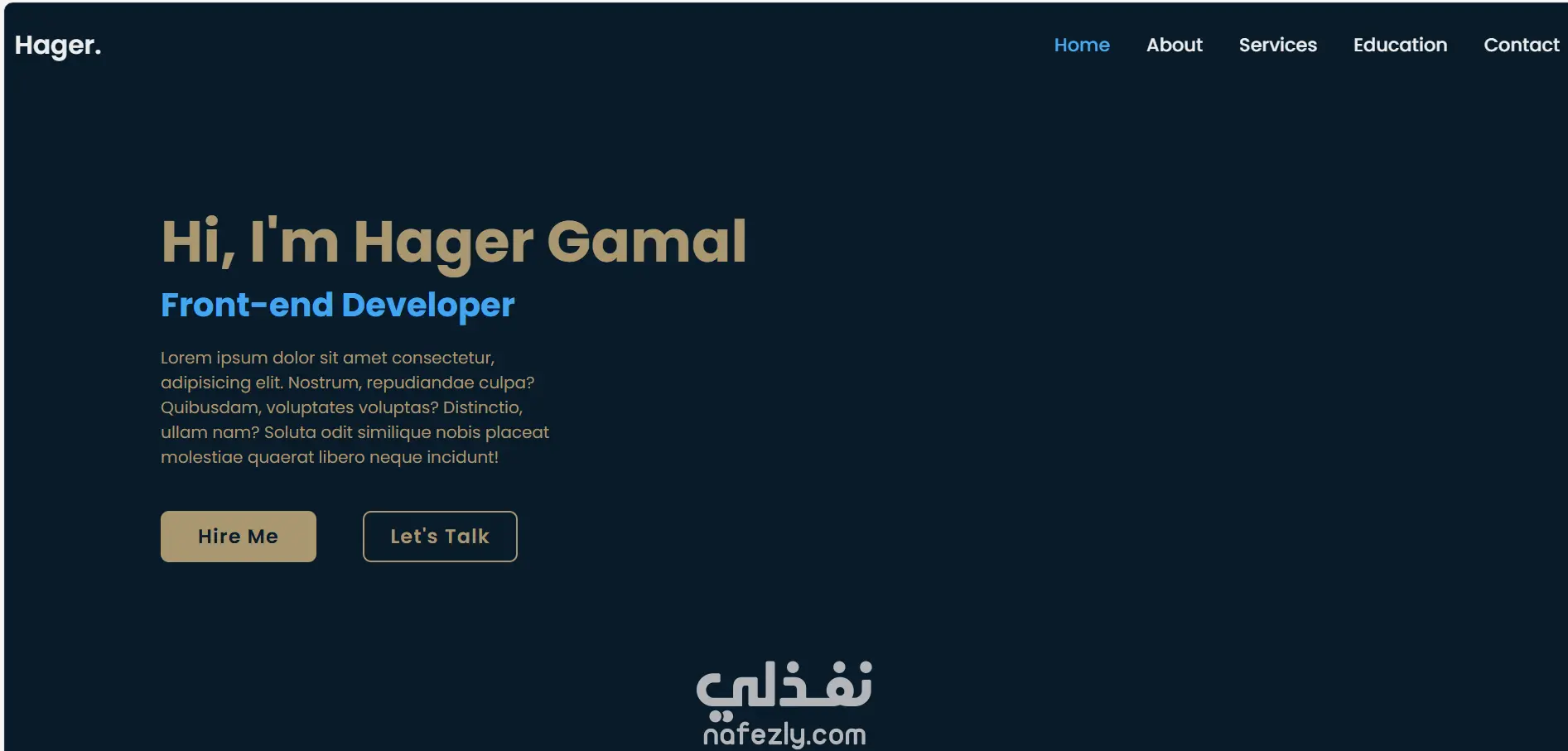 🔹 Portfolio Website (Front-End) قمت بتطوير موقع بورتفوليو شخصي باستخدام HTML و CSS بتصميم بسيط ومتجاوب. الموقع يضم أقسام: Home, About, Services, Education, Projects, Contact، مع واجهة منظمة وسهلة الاستخدام لعرض المهارات والمشاريع بشكل احترافي.