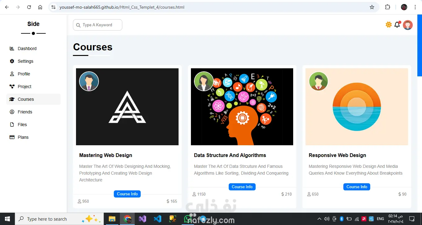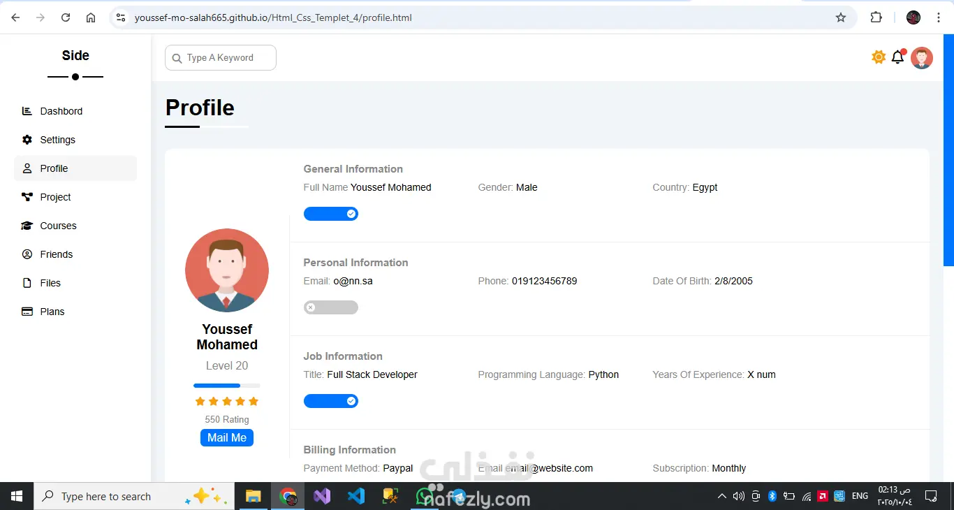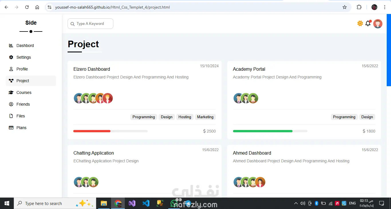 المشروع عبارة عن قالب لوحة تحكّم إدارية احترافي مصمم لعرض البيانات والمعلومات بشكل منظم وجذاب، ويتكوّن من عدة صفحات منفصلة، كل صفحة مخصّصة لجزء معيّن من المحتوى. يوفّر القالب شريطًا جانبيًا للتنقّل بين الصفحات المختلفة مثل الصفحة الرئيسية، الإعدادات، الملف الشخصي، المشاريع، الكورسات، الأصدقاء، الملفات، وخطط الأسعار. يتميز التصميم بعرض إحصائيات واضحة، ومخططات للأهداف السنوية، وأقسام للأخبار والمهام والمشاريع، بالإضافة إلى جداول ومنشورات وتذكيرات منظمة. تنسيق الصفحات واستخدام البطاقات والعناصر البصرية يمنح القالب مظهرًا احترافيًا وسهل الاستخدام، كما يمكن تخصيصه بسهولة ليتناسب مع أي نظام إداري أو لوحة بيانات تفاعلية. هيكل احترافي متكامل: مناسب للاستخدام كلوحة تحكّم لأي نظام إداري أو لوحة بيانات تنظيم المعلومات: كل صفحة لها مهمتها، المعلومات موزعة بوضوح دون تزاحم تنوع المحتوى: تعرض إحصائيات، مهام، مشاريع، أخبار، ملفات، تذكيرات ومشاركات تصميم بصري أنيق ومتناسق: استخدام البطاقات (cards)، الألوان، والعناصر البصرية يعطي انطباعًا نظيفًا ومهني قابلية التخصيص: يمكنك تعديل البيانات المتوفرة أو إضافة أقسام أو إزالة ما تريده بسهولة واجهة تفاعلية: تقديم محتوى “آخر الأخبار”، المهام، والتحديثات يضفي حيوية على الصفحة The project is a professional admin dashboard template designed to display data and information in a structured and visually appealing way. It consists of multiple separate pages, with each page dedicated to a specific type of content. The template includes a sidebar for easy navigation between different pages such as Home, Settings, Profile, Projects, Courses, Friends, Files, and Plans. The design features clear statistics, yearly goals charts, news and tasks sections, project tables, posts, and organized reminders. The page layout, along with the use of cards and visual elements, gives the template a clean, professional look that is easy to use. It can also be easily customized to fit any administrative system or interactive dashboard. Key strengths include: Professional structure: Suitable for use as a control panel for any admin system or data dashboard. Well-organized information: Each page has its specific purpose, and the content is distributed clearly without clutter. Content variety: The template includes statistics, tasks, projects, news, files, reminders, and posts. Elegant and consistent visual design: The use of cards, colors, and visual elements creates a clean and professional impression. Customizability: Data and sections can be easily modified, added, or removed to fit different needs. Interactive interface: Including elements like “Latest News,” tasks, and updates brings a dynamic and lively experience to the dashboard.