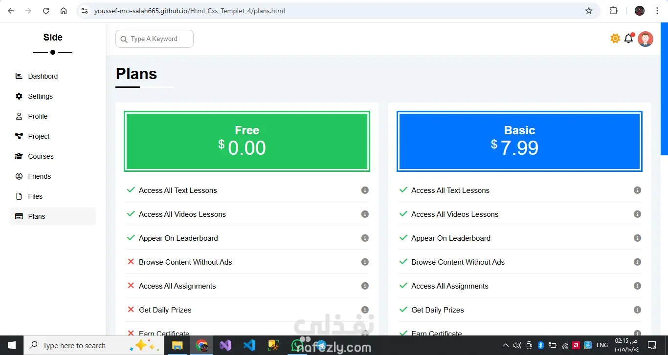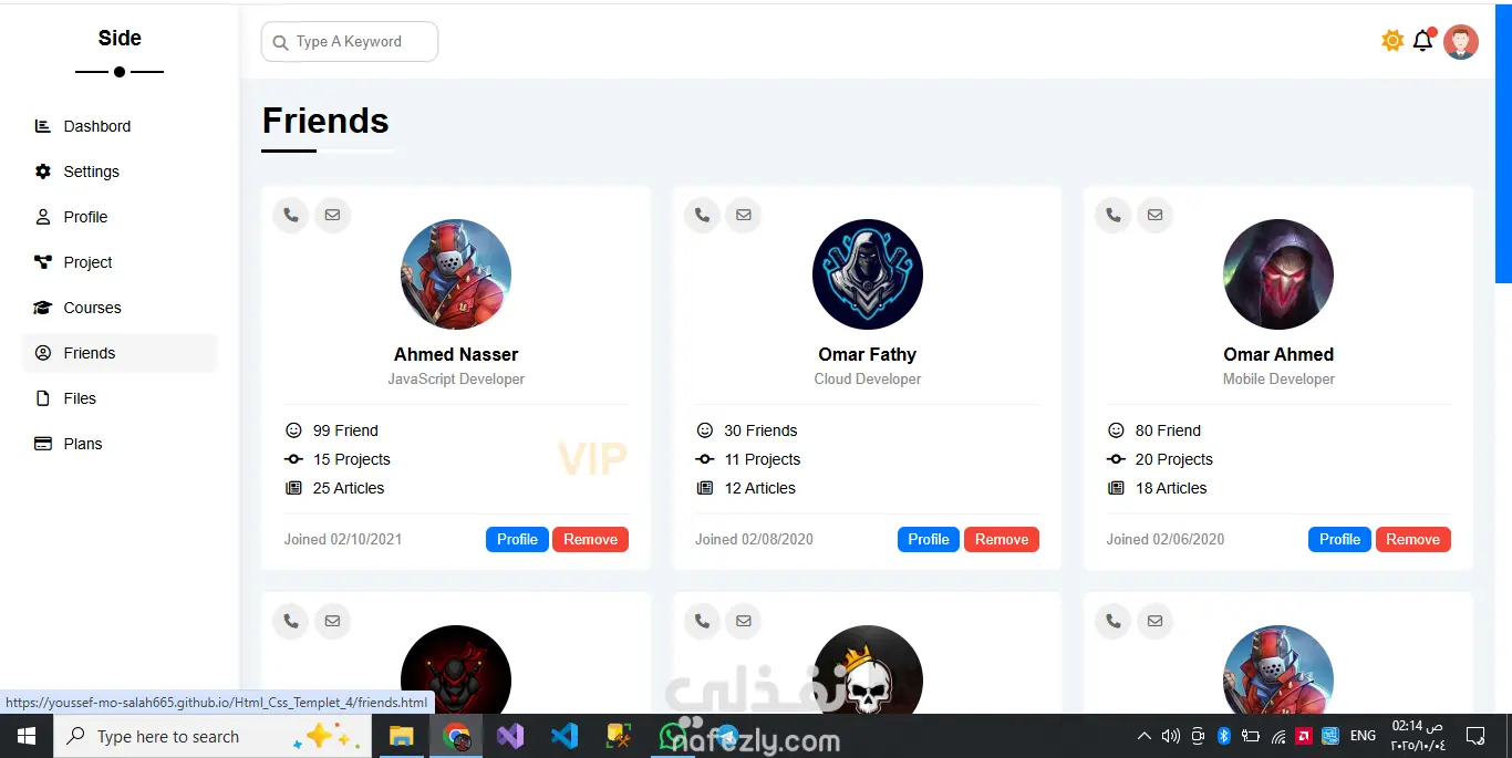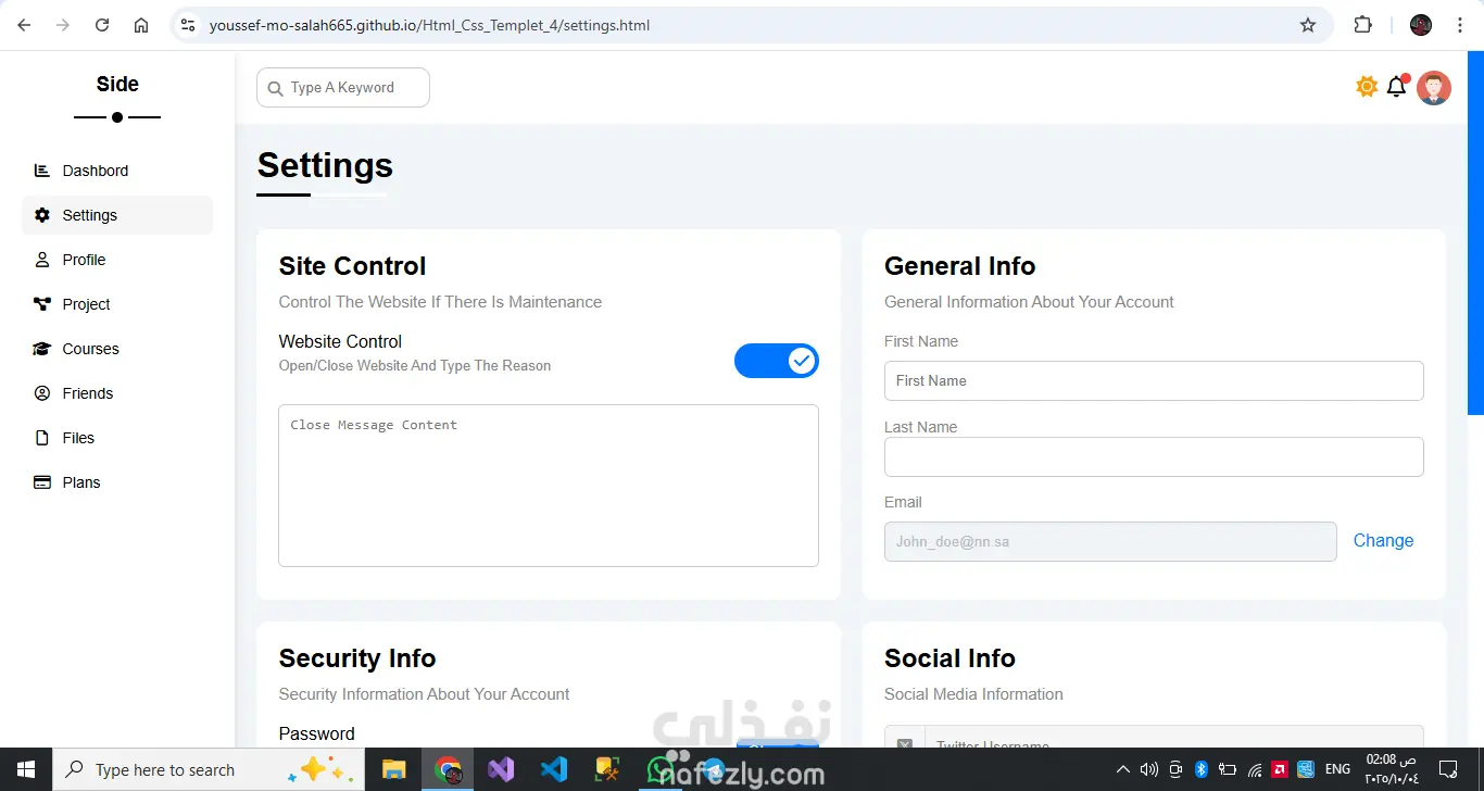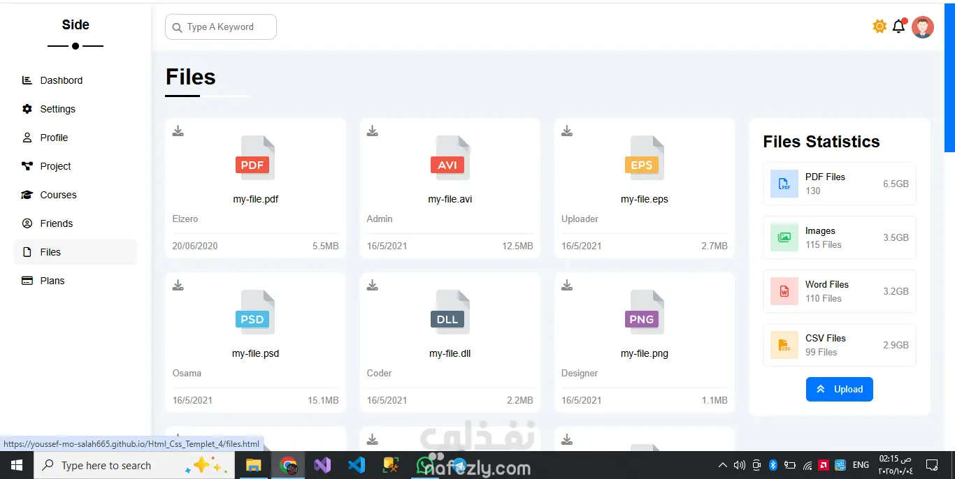 المشروع عبارة عن قالب لوحة تحكّم إدارية احترافي مصمم لعرض البيانات والمعلومات بشكل منظم وجذاب، ويتكوّن من عدة صفحات منفصلة، كل صفحة مخصّصة لجزء معيّن من المحتوى. يوفّر القالب شريطًا جانبيًا للتنقّل بين الصفحات المختلفة مثل الصفحة الرئيسية، الإعدادات، الملف الشخصي، المشاريع، الكورسات، الأصدقاء، الملفات، وخطط الأسعار. يتميز التصميم بعرض إحصائيات واضحة، ومخططات للأهداف السنوية، وأقسام للأخبار والمهام والمشاريع، بالإضافة إلى جداول ومنشورات وتذكيرات منظمة. تنسيق الصفحات واستخدام البطاقات والعناصر البصرية يمنح القالب مظهرًا احترافيًا وسهل الاستخدام، كما يمكن تخصيصه بسهولة ليتناسب مع أي نظام إداري أو لوحة بيانات تفاعلية. هيكل احترافي متكامل: مناسب للاستخدام كلوحة تحكّم لأي نظام إداري أو لوحة بيانات تنظيم المعلومات: كل صفحة لها مهمتها، المعلومات موزعة بوضوح دون تزاحم تنوع المحتوى: تعرض إحصائيات، مهام، مشاريع، أخبار، ملفات، تذكيرات ومشاركات تصميم بصري أنيق ومتناسق: استخدام البطاقات (cards)، الألوان، والعناصر البصرية يعطي انطباعًا نظيفًا ومهني قابلية التخصيص: يمكنك تعديل البيانات المتوفرة أو إضافة أقسام أو إزالة ما تريده بسهولة واجهة تفاعلية: تقديم محتوى “آخر الأخبار”، المهام، والتحديثات يضفي حيوية على الصفحة The project is a professional admin dashboard template designed to display data and information in a structured and visually appealing way. It consists of multiple separate pages, with each page dedicated to a specific type of content. The template includes a sidebar for easy navigation between different pages such as Home, Settings, Profile, Projects, Courses, Friends, Files, and Plans. The design features clear statistics, yearly goals charts, news and tasks sections, project tables, posts, and organized reminders. The page layout, along with the use of cards and visual elements, gives the template a clean, professional look that is easy to use. It can also be easily customized to fit any administrative system or interactive dashboard. Key strengths include: Professional structure: Suitable for use as a control panel for any admin system or data dashboard. Well-organized information: Each page has its specific purpose, and the content is distributed clearly without clutter. Content variety: The template includes statistics, tasks, projects, news, files, reminders, and posts. Elegant and consistent visual design: The use of cards, colors, and visual elements creates a clean and professional impression. Customizability: Data and sections can be easily modified, added, or removed to fit different needs. Interactive interface: Including elements like “Latest News,” tasks, and updates brings a dynamic and lively experience to the dashboard.