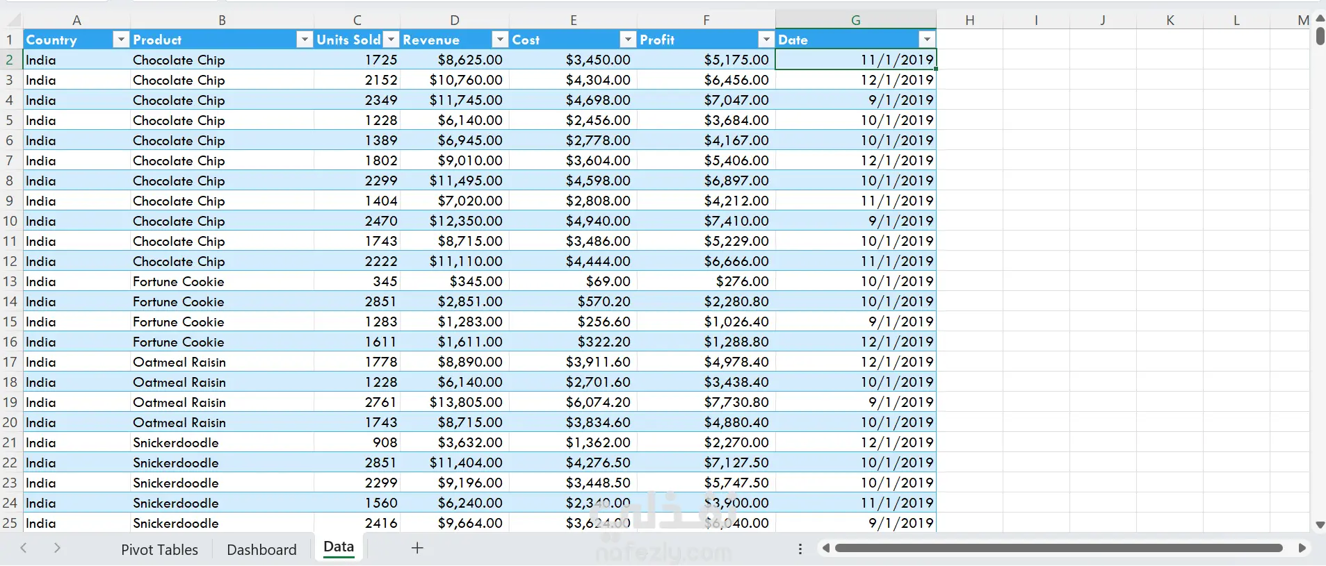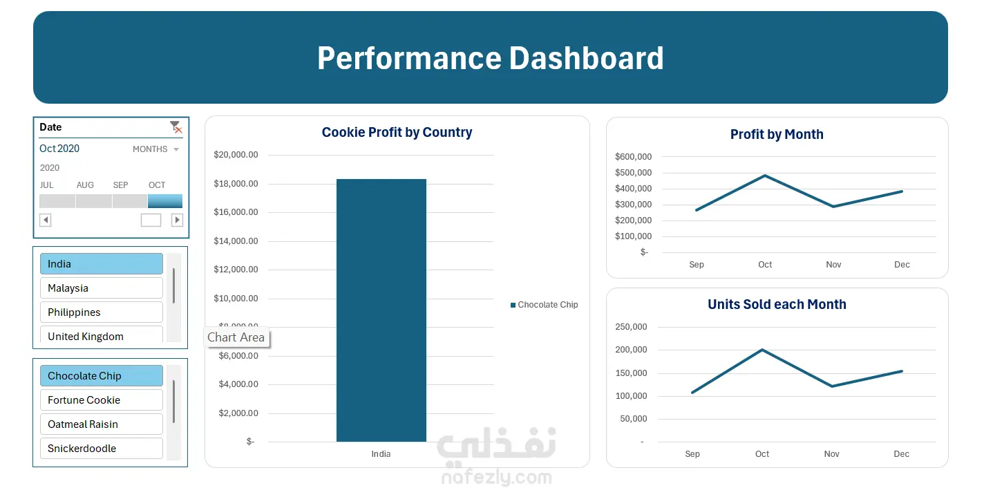 • أدوات تصفية تفاعلية: لعرض البيانات حسب التاريخ (سنوات وأشهر محددة)، الدولة، والمنتج (أنواع مختلفة من الكوكيز).