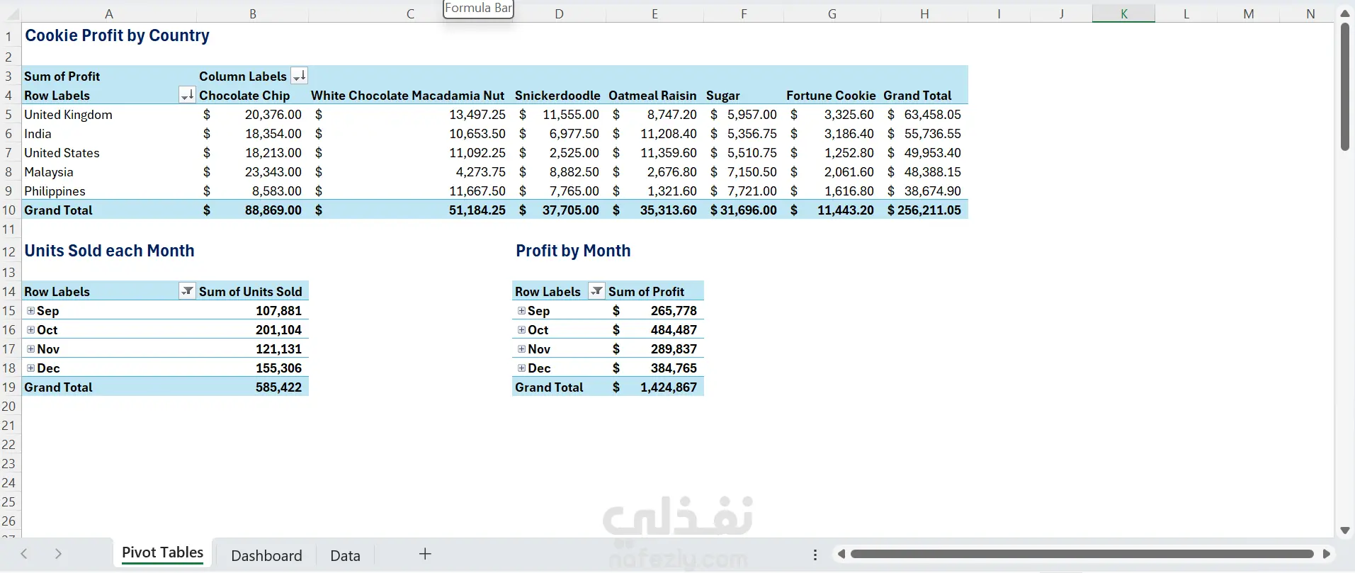 • تحليل ربح الكوكيز حسب الدولة مع إبراز مساهمة كل منتج.
