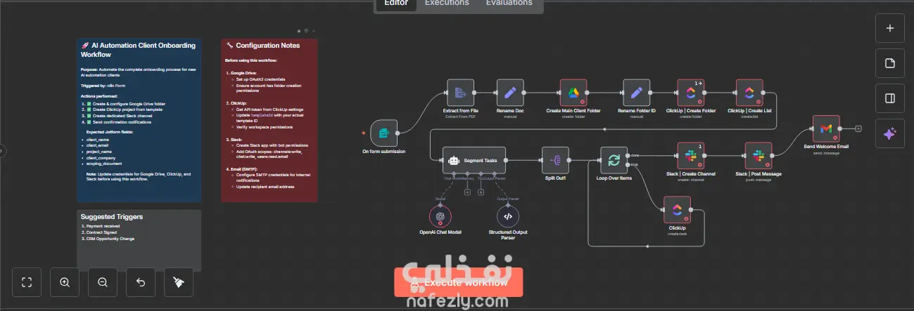 يضمن تنظيم وحفظ جميع معلومات العميل على منصات مختلفة مثل Google Drive وClickUp وSlack بطريقة مترابطة متكاملة.