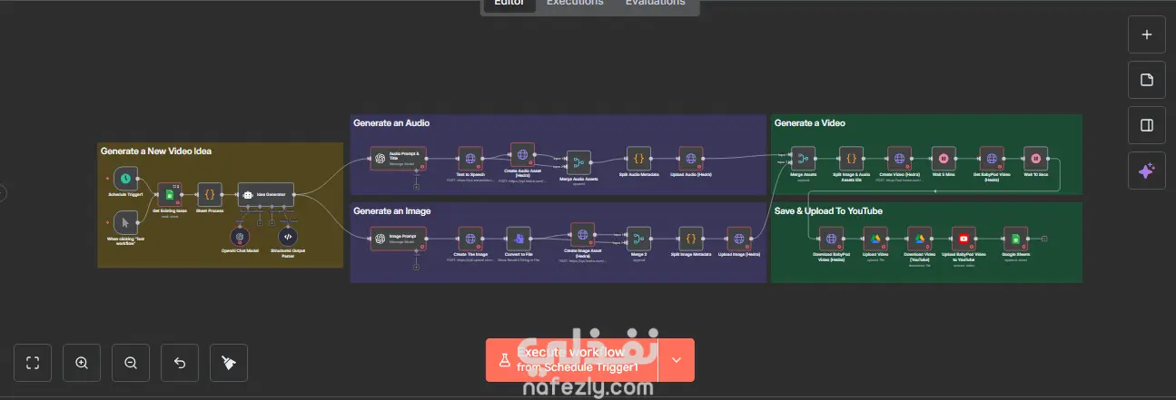 نظام عمل آلي متكامل لإنتاج فيديوهات جديدة ورفعها تلقائيًا على منصة يوتيوب،