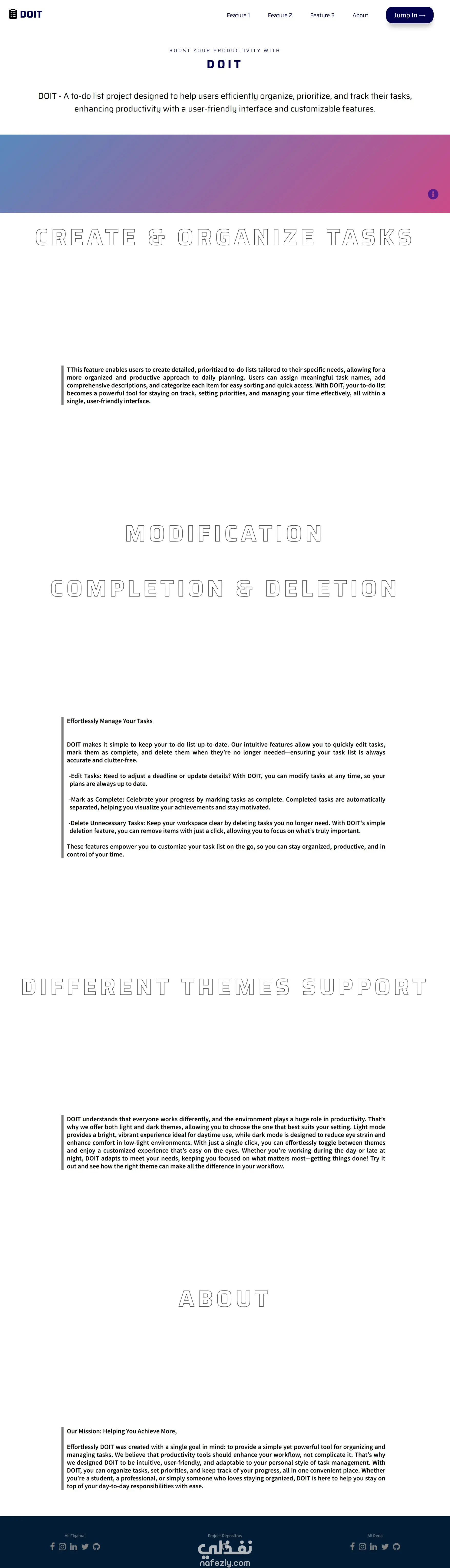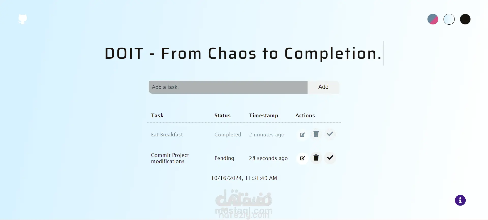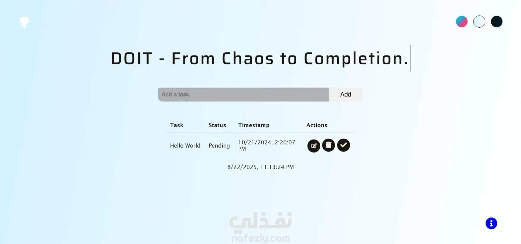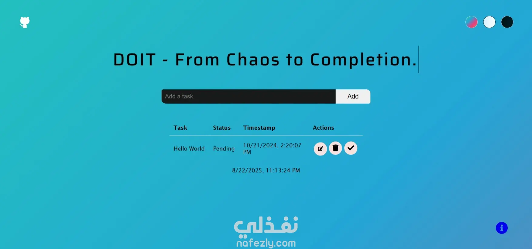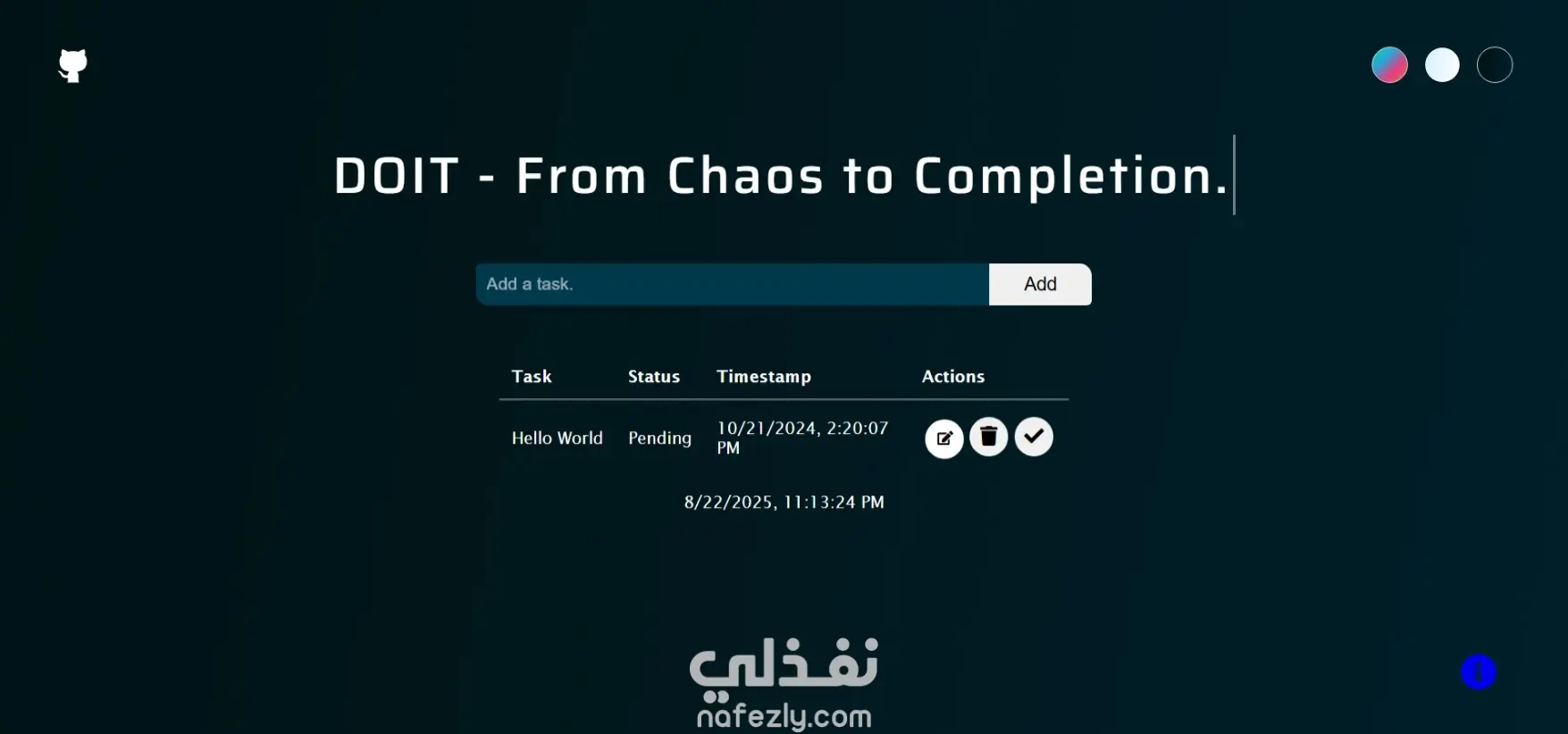 DOIT is a task management application that helps users organize, prioritize, and track their tasks efficiently. It features a user-friendly interface, session-based task management, and customizable light/dark themes. Powered by Node.js, Express, and MongoDB.