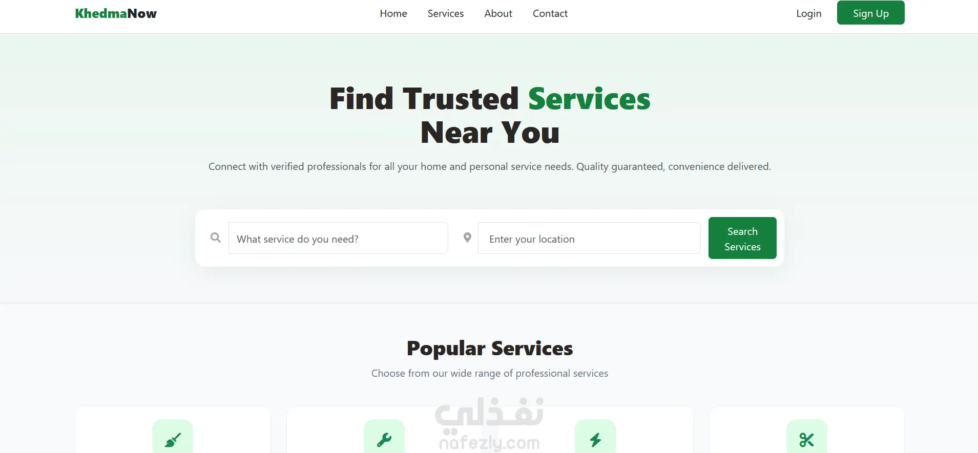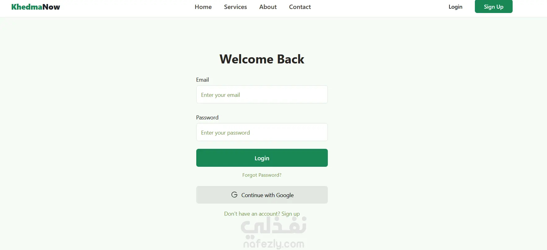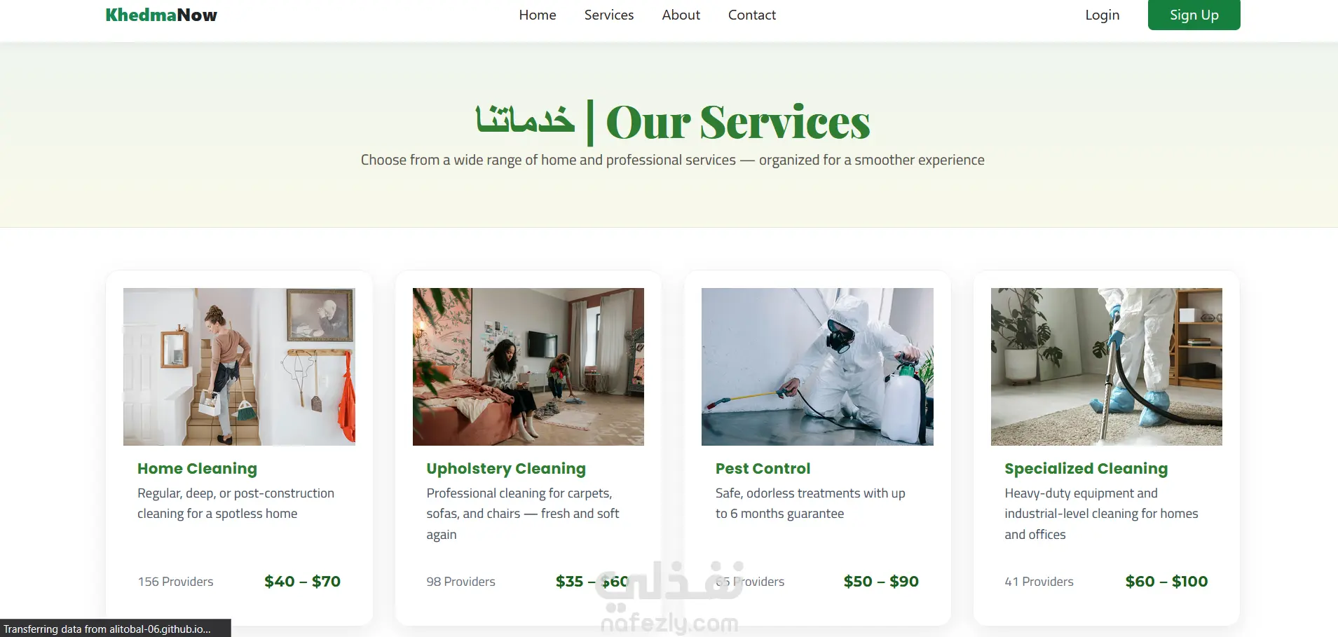 الصفحة الرئيسية – صفحة الخدمات – صفحة تسجيل الدخول – صفحة انشاء حساب.