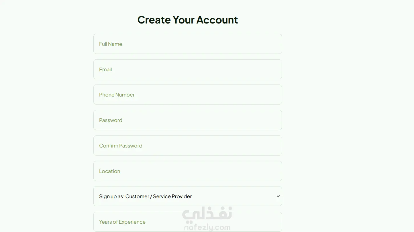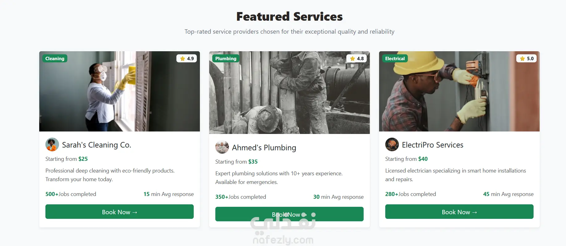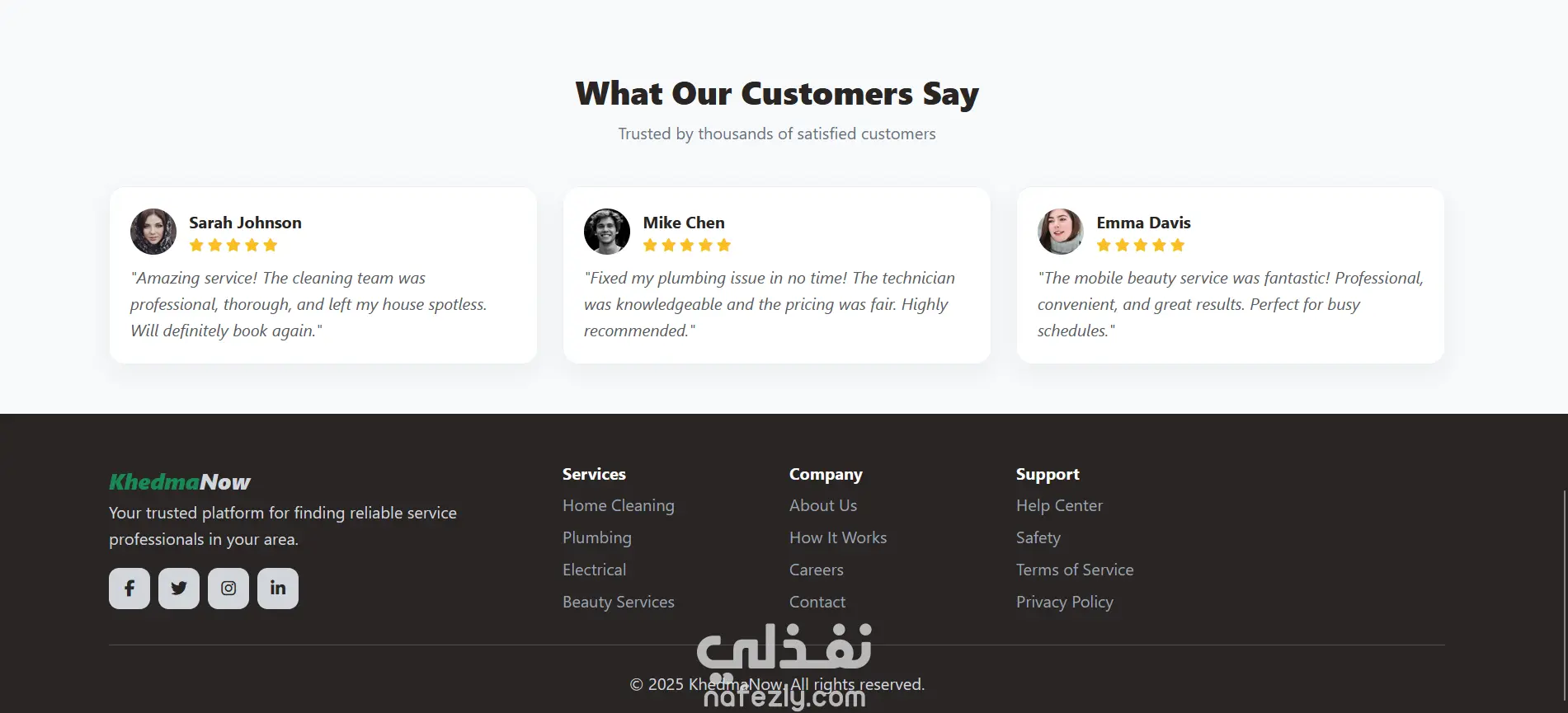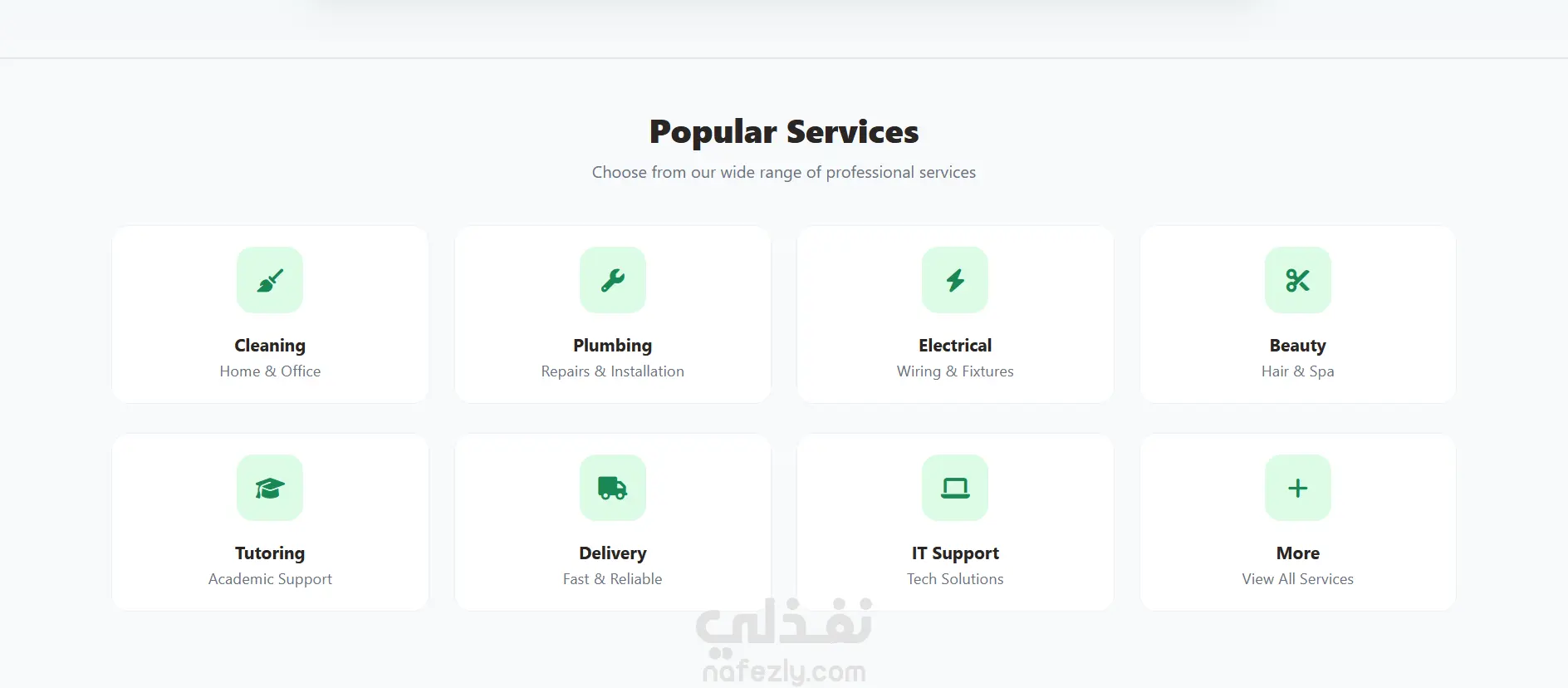 الصفحة الرئيسية – صفحة الخدمات – صفحة تسجيل الدخول – صفحة انشاء حساب.