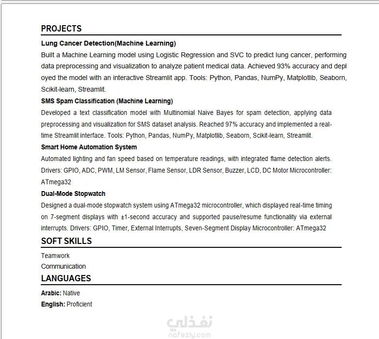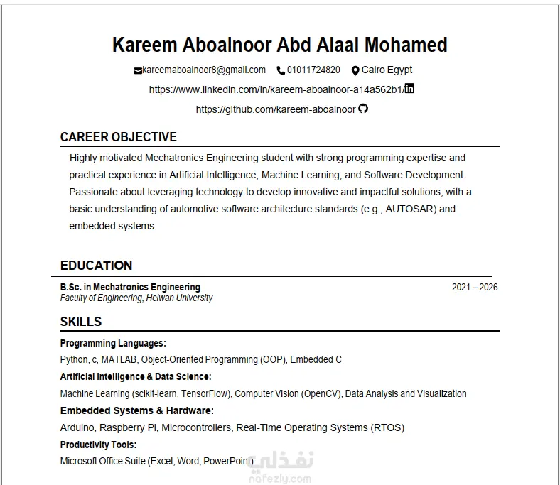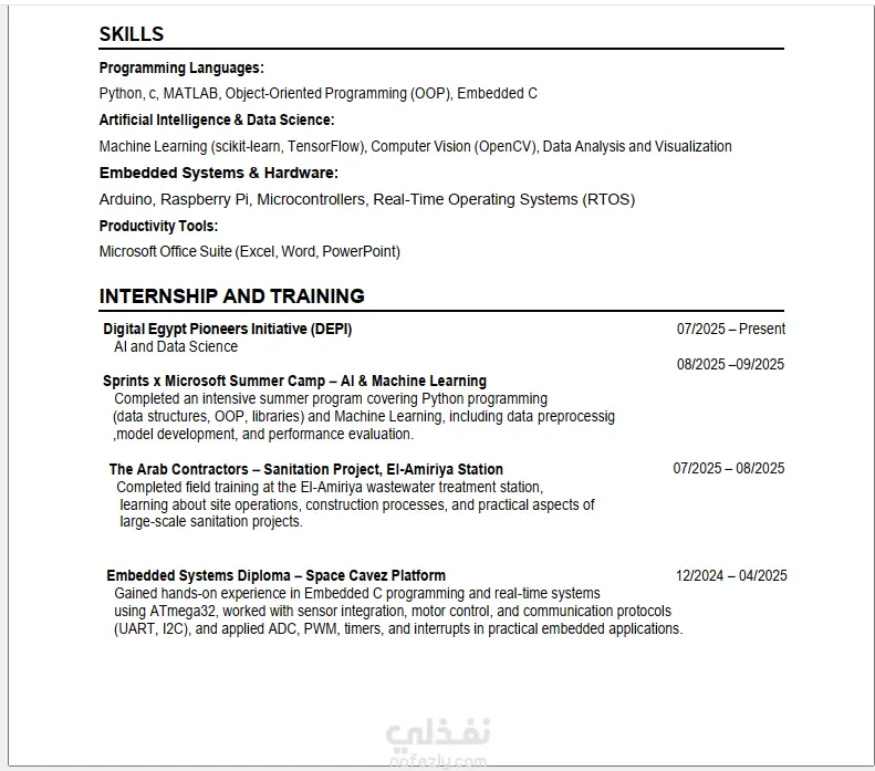 هساعدك تعمل سيرة ذاتية احترافية ومناسبة لمجالك تكون متوافقة مع نظام الـ ATS اللي بتستخدمه أغلب الشركات في فرز السير الذاتية. الخدمة دي مناسبة سواء كنت طالب أو خريج جديد وعايز تقدم على تدريب أو شغل أول مرة. بشتغل على السيرة بحيث: تكون منظمة وواضحة، بدون تصاميم معقدة تعطل قراءة النظام. أستخدم تنسيق متوافق مع الـATS (بدون جداول أو عناصر بصرية تمنع القراءة). أضيف الكلمات المفتاحية المناسبة لتخصصك (زي “Mechatronics”، “Python”، “Manufacturing”، حسب مجالك). أرتب الأقسام بطريقة تناسب وضعك كطالب أو خريج (تعليم – مشاريع – مهارات – تدريبات – أنشطة). أسلمها بصيغة Word + PDF علشان تقدر تعدل بسهولة. ممكن أعملها بالعربي أو بالإنجليزي حسب اللي تحتاجه.