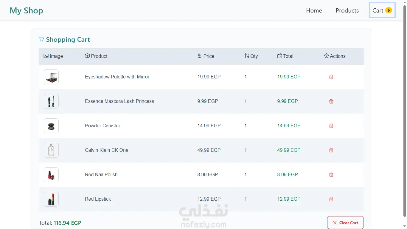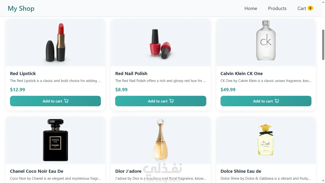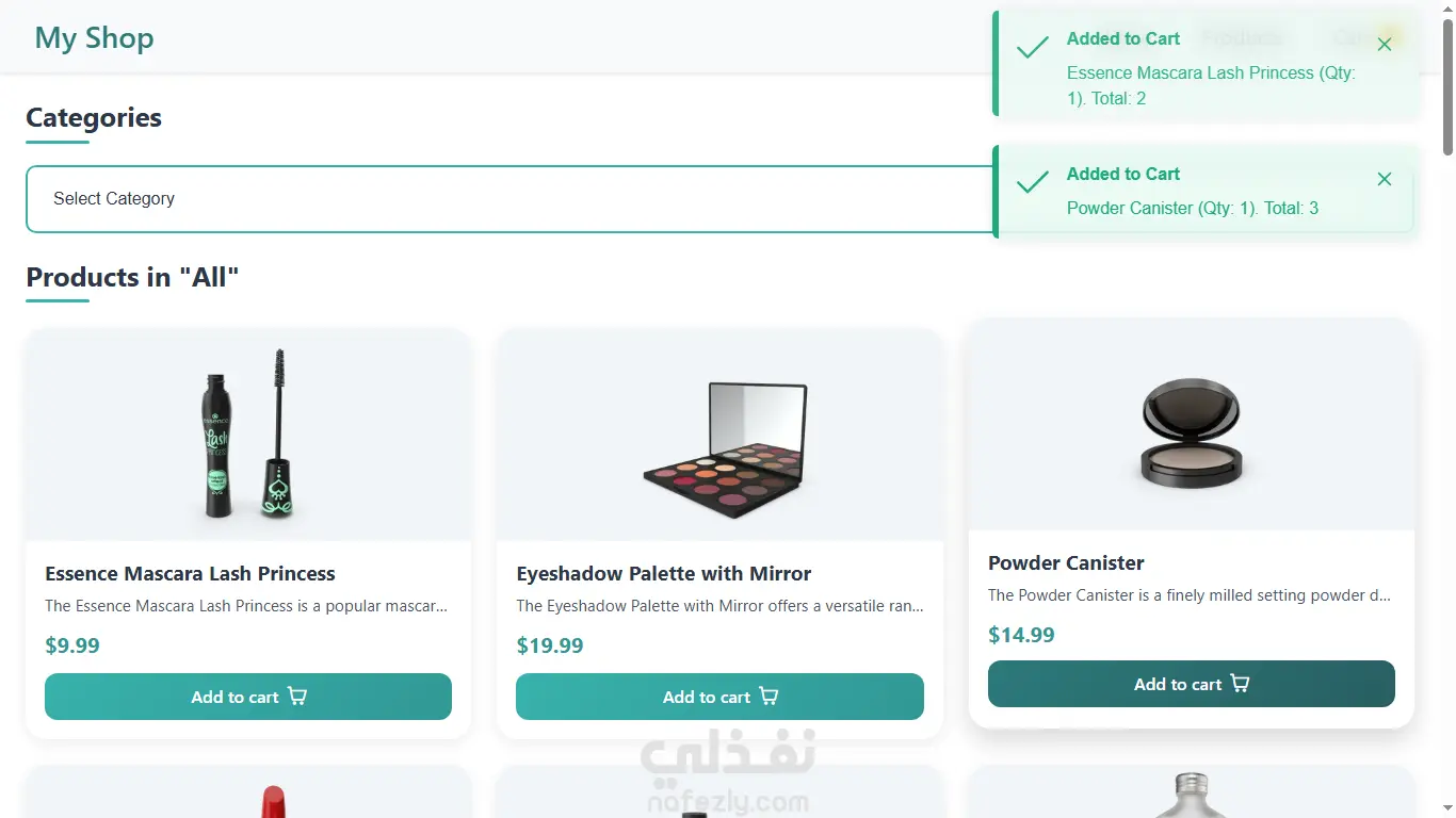 يتيح للمستخدمين استعراض المنتجات، إضافتها إلى السلة، حذف المنتجات، مع حساب السعر الإجمالي تلقائيًا.