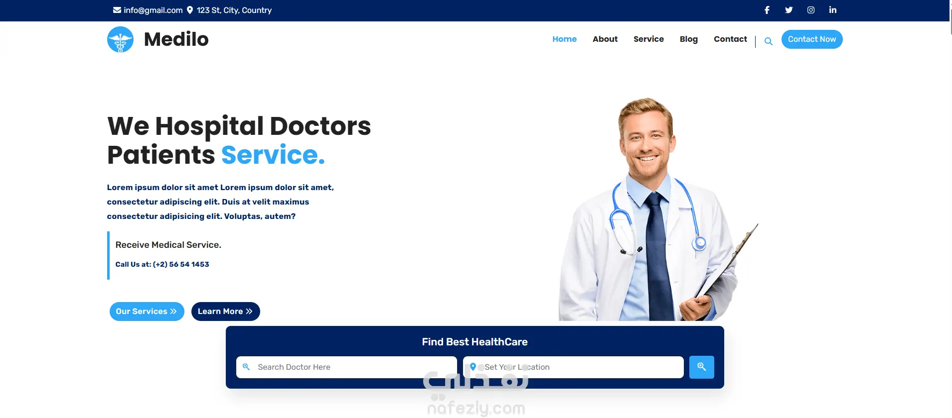 قسم بحث أسفل الهيرو للعثور على الطبيب أو الخدمة (Search Doctor – Set Location).