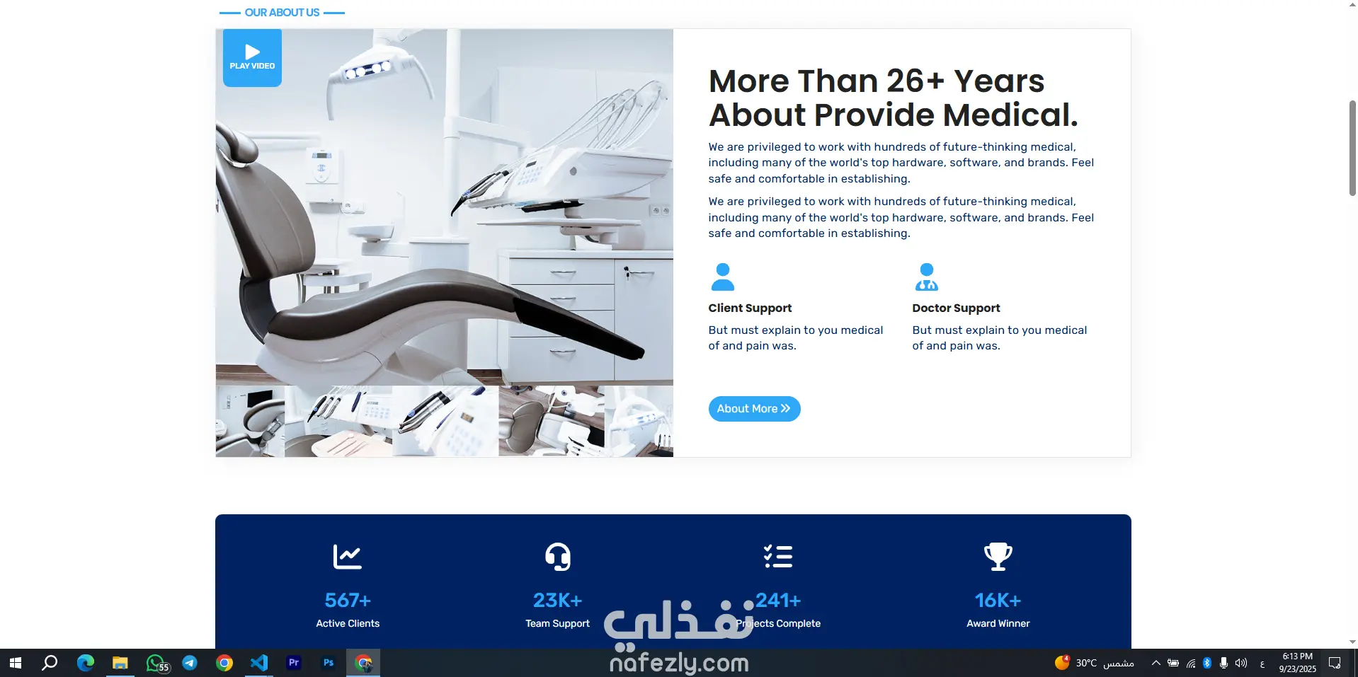 فقرة نصية تعريفية مع أزرار Call to Action (Our Services – Learn More).