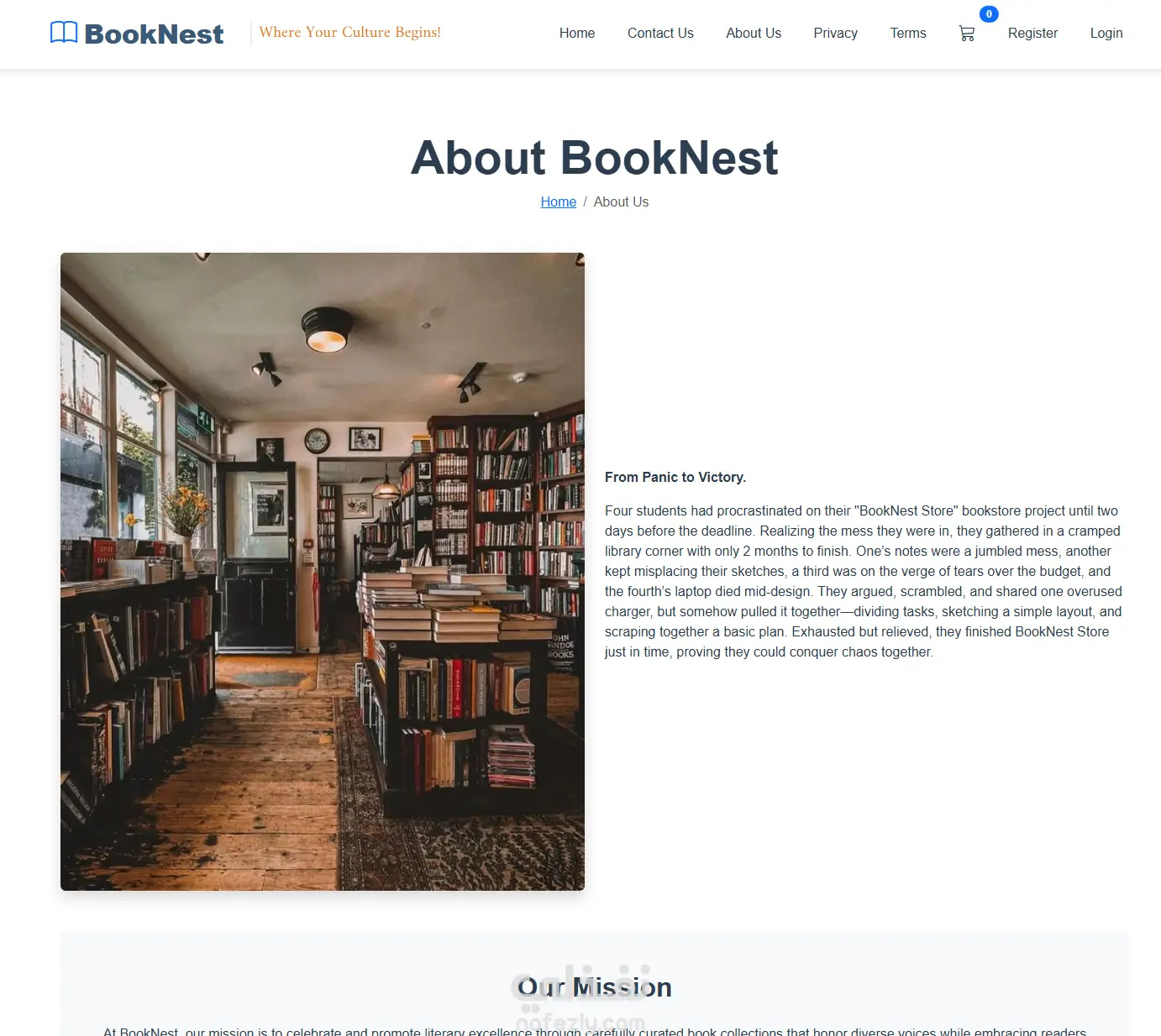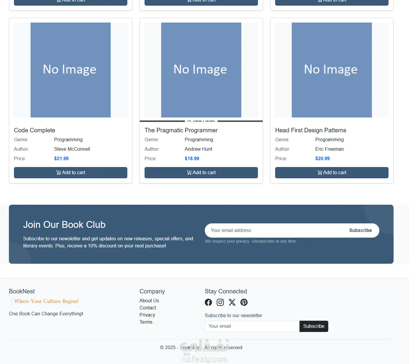 BookNest هو تطبيق ويب يهدف إلى تسهيل إدارة وحجز الكتب. تم تطويره باستخدام تقنيات HTML, CSS, C#, SQL مع التركيز على واجهة بسيطة وسهلة الاستخدام تضمن تجربة مريحة للمستخدم. -المشروع يقدم مجموعة من الخصائص المهمة، من بينها: -إدارة الكتب بإضافة بيانات جديدة أو تعديلها أو حذفها. -البحث عن الكتب بشكل سريع وفعّال. -إدارة حسابات المستخدمين مع إمكانية تحديد الصلاحيات. -نظام متكامل للحجز وتتبع حالة الكتب. -قاعدة بيانات منظمة وآمنة لحفظ المعلومات. تم تطوير BookNest مع الحرص على كتابة كود نظيف وقابل للتطوير في المستقبل، مما يجعله مشروعاً عملياً يمكن البناء عليه وتوسيعه.