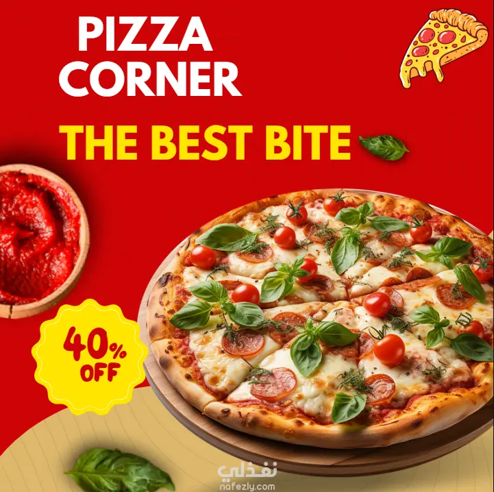 بوستر دعائي لمطعم بيتزا بتصميم جذاب ومتناغم، مناسب للإعلانات على السوشيال ميديا أو الطباعة.