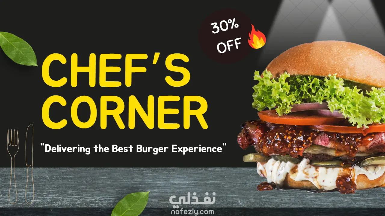 تصميم بوستر دعائي أنيق لمطعم برجر بجودة عالية وأسلوب بسيط وجذاب.