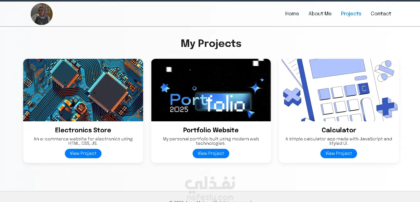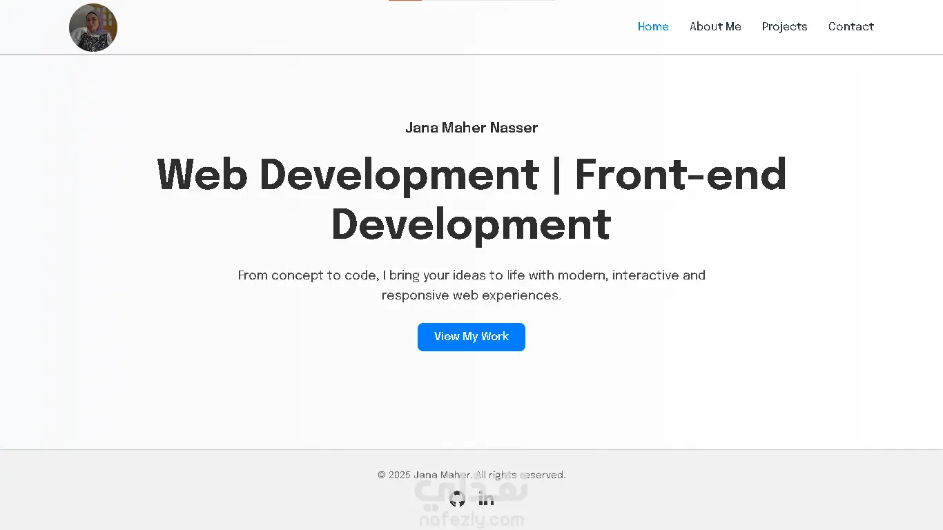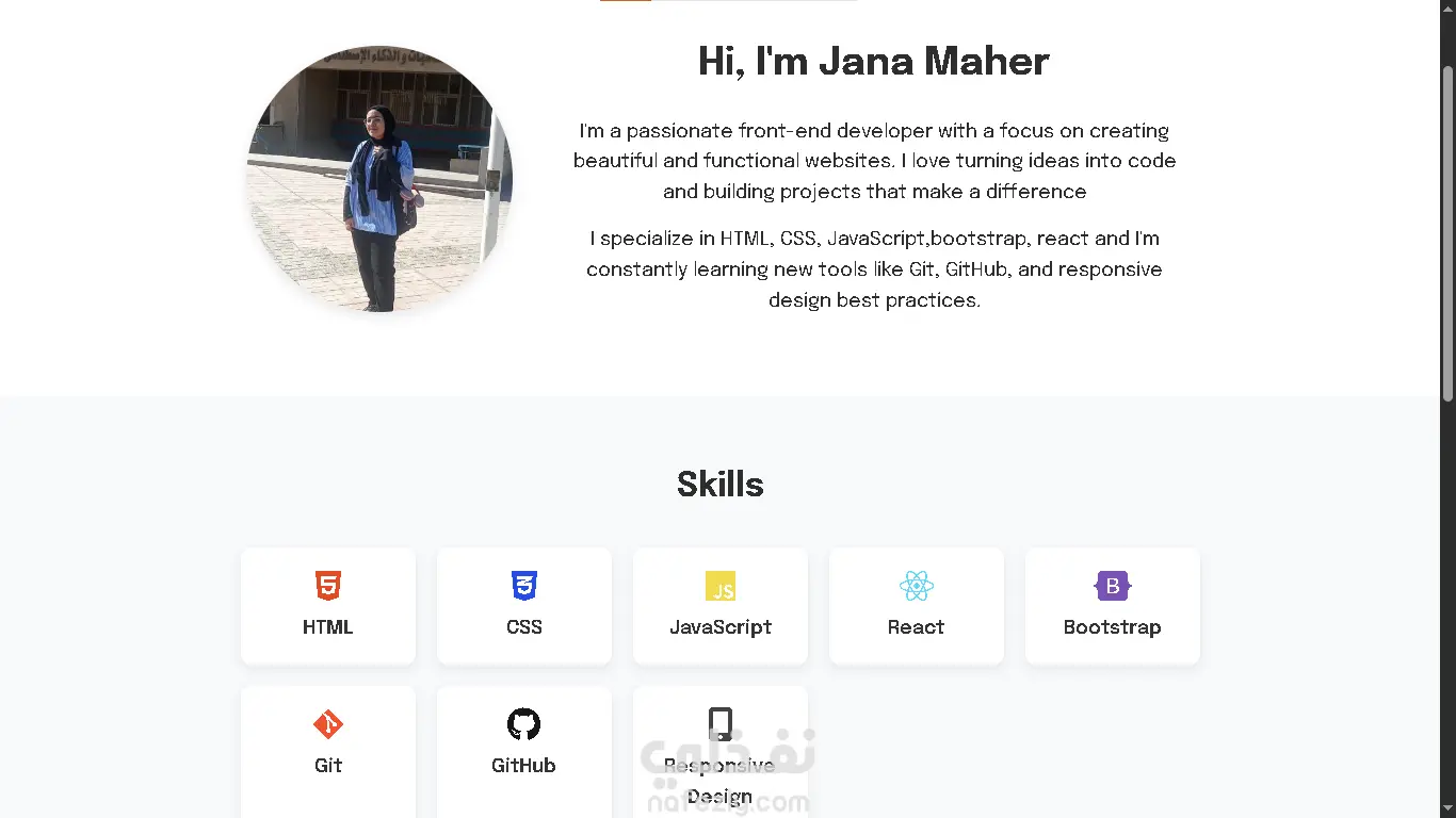 موقعي الشخصي (Portfolio Website) هو مساحة رقمية بتعكس هويتي كمطوّرة واجهات أمامية، وبيعرض بشكل منظم كل المهارات والمشاريع اللي اشتغلت عليها. الهدف من الموقع هو تقديم صورة احترافية متكاملة للعملاء وأصحاب الأعمال، بحيث يقدروا يتعرفوا عليّ وعلى خبراتي بسهولة. محتوى الموقع: الصفحة الرئيسية (Home): مقدمة مختصرة عني، تعرّف الزائر بهويتي ومجالي. صفحة "About Me": فيها نبذة شخصية عني، مسيرتي، وأهدافي كمطوّرة. صفحة Skills: بتعرض أهم المهارات التقنية اللي أتقنها مثل HTML, CSS, JavaScript, Bootstrap, React وغيرها، مع إبراز قدرتي على استخدام أدوات حديثة. صفحة Projects/Portfolio: فيها عينات عملية من المشاريع اللي طورتها زي موقع متجر الإلكترونيات، موقع الإكسسوارات، وصفحات تفاعلية مختلفة. صفحة Contact: نموذج للتواصل ومعلومات مباشرة للي يحب يتواصل معايا سواء للاستفسار أو التعاون. المميزات: تصميم عصري وبسيط بواجهة مستخدم جذابة. متجاوب (Responsive) وبيشتغل بكفاءة على الكمبيوتر والموبايل. بيركز على إبراز الشغل العملي بدل الكلام النظري، علشان يدي انطباع قوي وموثوق للزائر. الموقع يعتبر مرجع شامل لكل أعمالي، وهو انعكاس لشغفي بتطوير الويب وحرصي على التطوير المستمر.