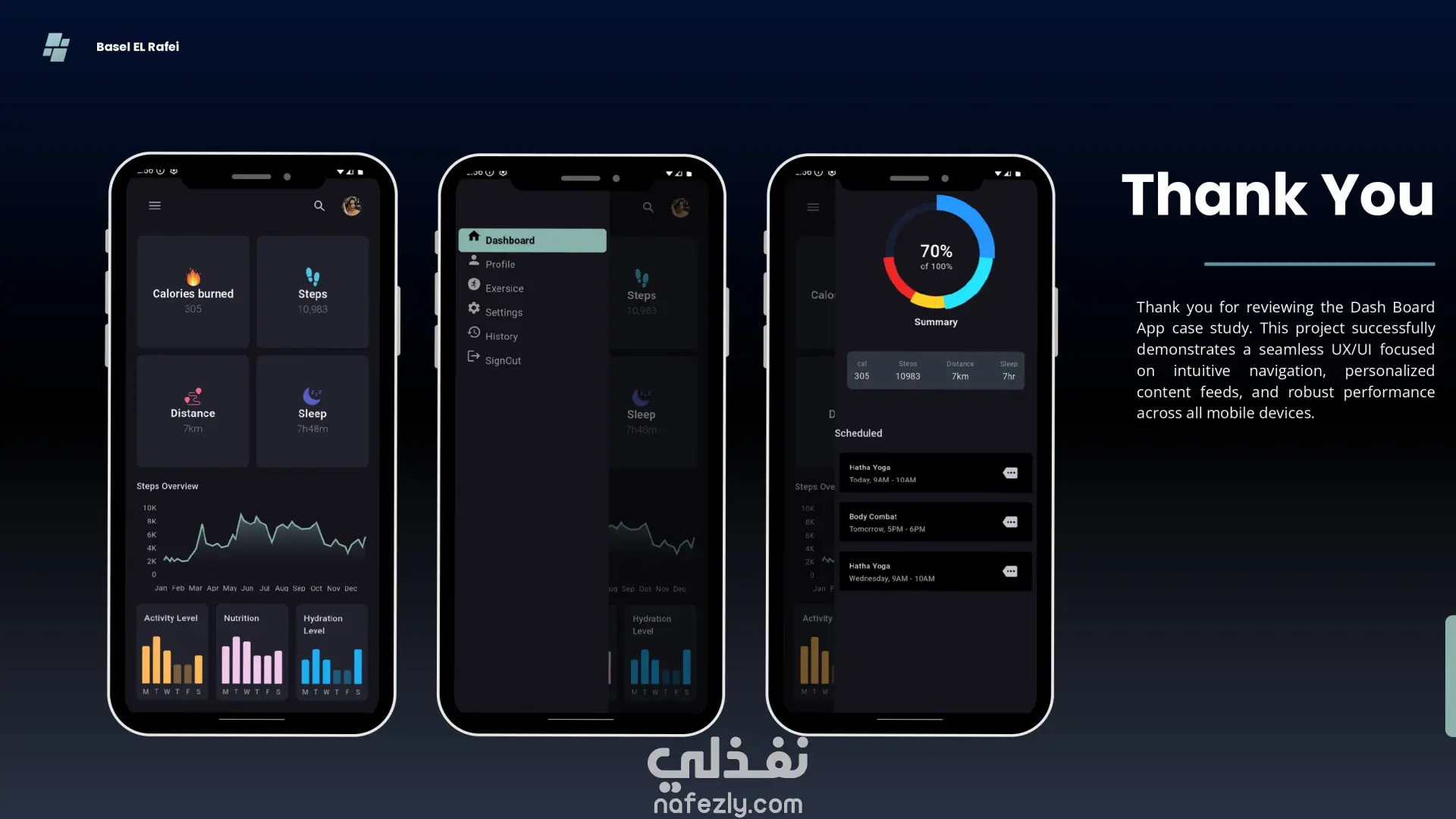 تطوير لوحة تحكم تعرض ملخص الأنشطة اليومية، مثل رسم بياني تفاعلي للحركة ونسب التقدم بشكل دائري.