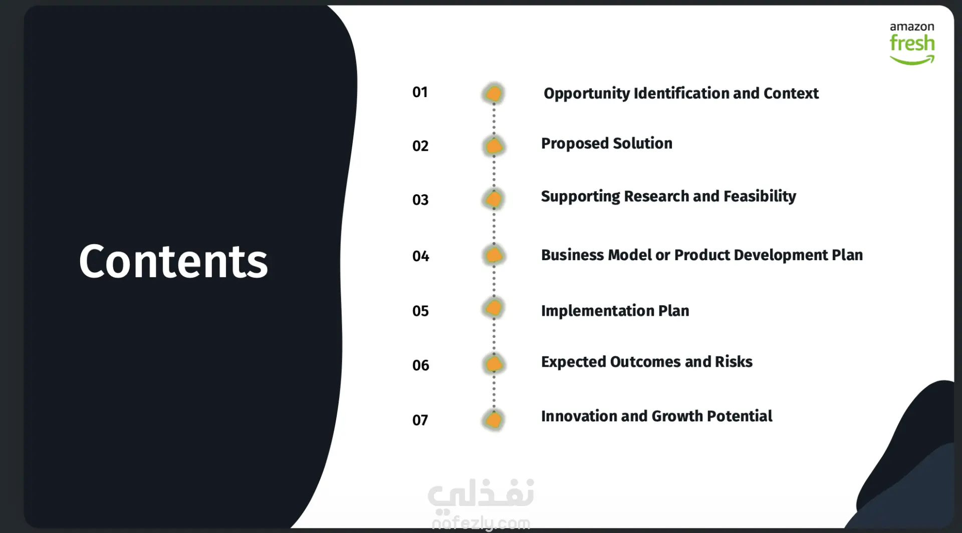 هيكلة منطقية تغطي: تحديد الفرصة، الحل المقترح، الدراسة السوقية، نموذج العمل، خطة التنفيذ، والمخاطر