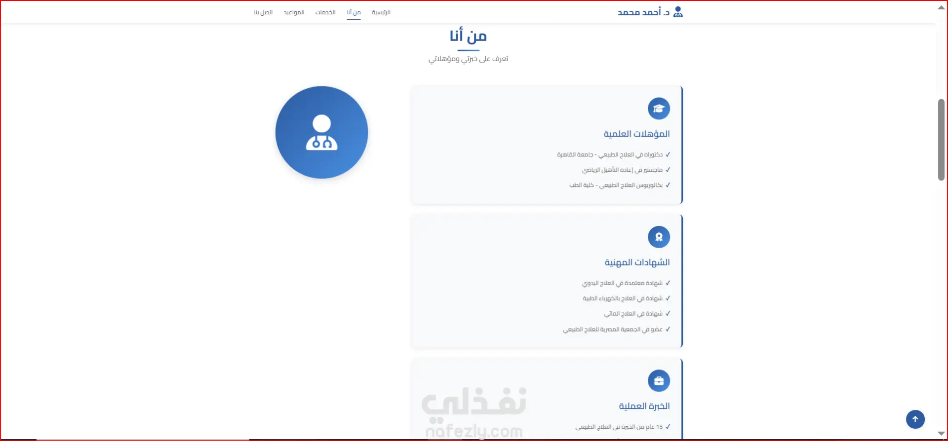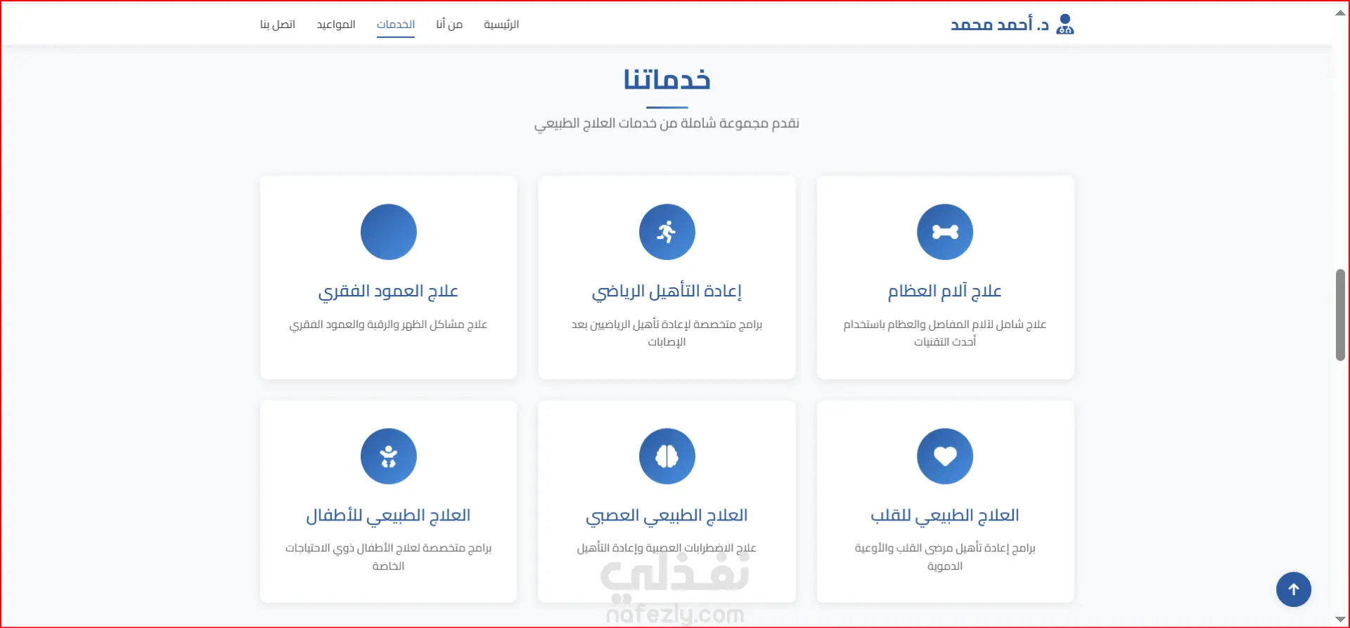 الموقع الإلكتروني مصمم ليكون واجهة شاملة لعيادة متخصصة في العلاج الطبيعي والتأهيل، ويهدف إلى: تقديم العيادة والطبيب: التعريف بالدكتور أحمد محمد، خبرته العلمية (دكتوراه، ماجستير، دبلوم، خبرة 15 سنة)، وشهاداته المهنية المختلفة في مجالات العلاج الطبيعي المتنوعة. عرض الخدمات: إبراز التخصصات والخدمات العلاجية الشاملة التي تقدمها العيادة، والتي تغطي مجموعة واسعة من الحالات، أبرزها: علاج آلام العظام والمفاصل. علاج العمود الفقري (مشاكل الظهر والرقبة). إعادة التأهيل الرياضي (بعد الإصابات). العلاج الطبيعي للأطفال (ذوي الاحتياجات الخاصة). العلاج الطبيعي العصبي (اضطرابات عصبية). العلاج الطبيعي للقلب (التأهيل القلبي والرئوي). إدارة المواعيد والتواصل: توفير آلية واضحة للتواصل وحجز المواعيد من خلال: صفحة "اتصل بنا" لتقديم الاستفسارات والشكاوى عبر نموذج إلكتروني. عرض معلومات الاتصال الأساسية (العنوان: 123 شارع التحرير، رقم الهاتف: 7890 456 123 20+، البريد الإلكتروني: [email protected]). تحديد مواعيد العمل الرسمية للعيادة خلال أيام الأسبوع (السبت - الخميس: 2:00 م - 9:00 م، ويوم الجمعة: مغلق)، بالإضافة إلى توفير رقم للطوارئ متاح 24/7. بشكل عام، يركز المشروع على تقديم محتوى احترافي وموثوق يعزز الثقة في خبرة الطبيب وتخصصات العيادة، مع بنية موقع سهلة الاستخدام تمكن الزائر من معرفة معلومات مهمة عن الطبيب، الخدمات، ومواعيد التواصل والزيارة.