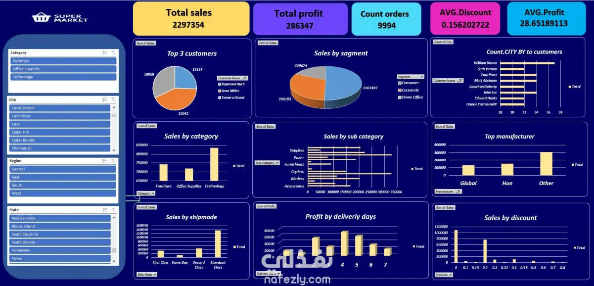 تم تنفيذ هذا المشروع لتحليل بيانات مبيعات أحد السوبرماركتات باستخدام Microsoft Excel، بهدف استخراج مؤشرات الأداء الرئيسية وفهم أنماط المبيعات وسلوك العملاء.