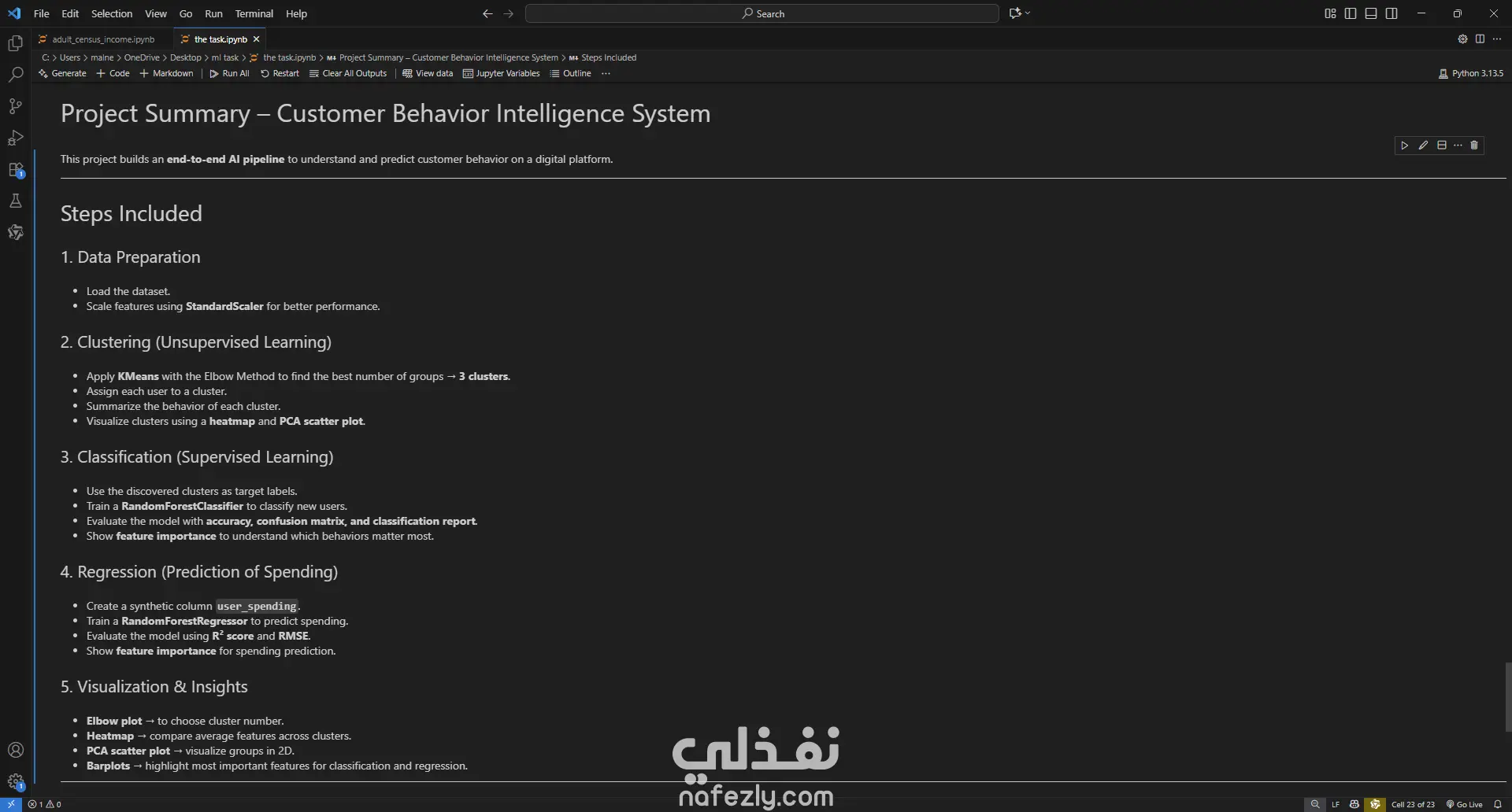 هل محتاج مشروع Data Science متكامل يبهر أي عميل أو لجنة أكاديمية؟ هقدملك تحليل بيانات كامل مع تصميم Machine Learning Pipelines احترافية تشمل التنظيف، الاستكشاف، النمذجة، والتقييم — كل ده بأسلوب عملي ومنظم يسهل تطبيقه أو تعديله على أي Data جديدة. مميزات الخدمة تنظيف ومعالجة البيانات إزالة القيم المفقودة والأخطاء لضمان دقة التحليل. EDA (Exploratory Data Analysis) رسومات وVisualizations توضّح العلاقات والأنماط في البيانات. Feature Engineering & Preprocessing تحويل البيانات وتجهيزها لتكون صالحة للتعلم الآلي. Unsupervised Learning تطبيق Clustering (زي KMeans) مع Visualization لعرض النتائج. Supervised Learning Classification باستخدام خوارزميات قوية + تقييم النموذج. Pipeline مرن كود منظم تقدر تعيد استخدامه بسهولة على أي بيانات جديدة. ما الذي ستستلمه Jupyter Notebook عملي كود كامل مشروح خطوة بخطوة. ملخص PDF شرح كل جزء في الكود وليه استخدمناه ملف ZIP فيه الكود + البيانات + README مبسّط للتشغيل. إرشادات تشغيل خطوات واضحة علشان تشغّل المشروع بسهولة. (اختياري) Zoom Meeting قصير أشرحلك فيه تفاصيل المشروع بعد التسليم.