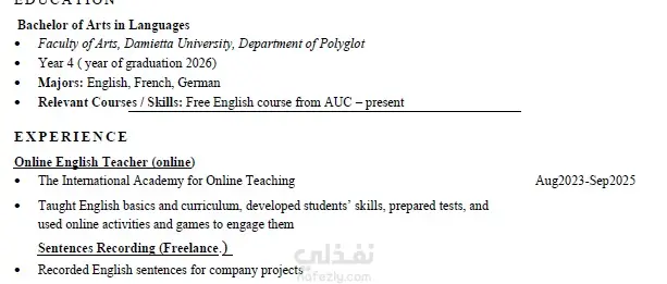 خدمة كتابة سيرة ذاتية احترافية باللغة الإنجليزية (متوافقة مع نظام الـATS) أقدّم خدمة إعداد وتصميم سيرة ذاتية احترافية باللغة الإنجليزية، متوافقة مع نظام الـATS لضمان قبولها في الشركات الكبرى والمنصات العالمية. تشمل الخدمة: كتابة محتوى احترافي وواضح يعرض خبراتك ومهاراتك بطريقة قوية. استخدام الكلمات المفتاحية المناسبة لنظام الـATS. تنسيق وتصميم بسيط ومرتب يسهل قراءته إلكترونيًا. إمكانية تعديل السيرة الذاتية حتى الرضا التام. تسليم سريع بصيغة Word وPDF.