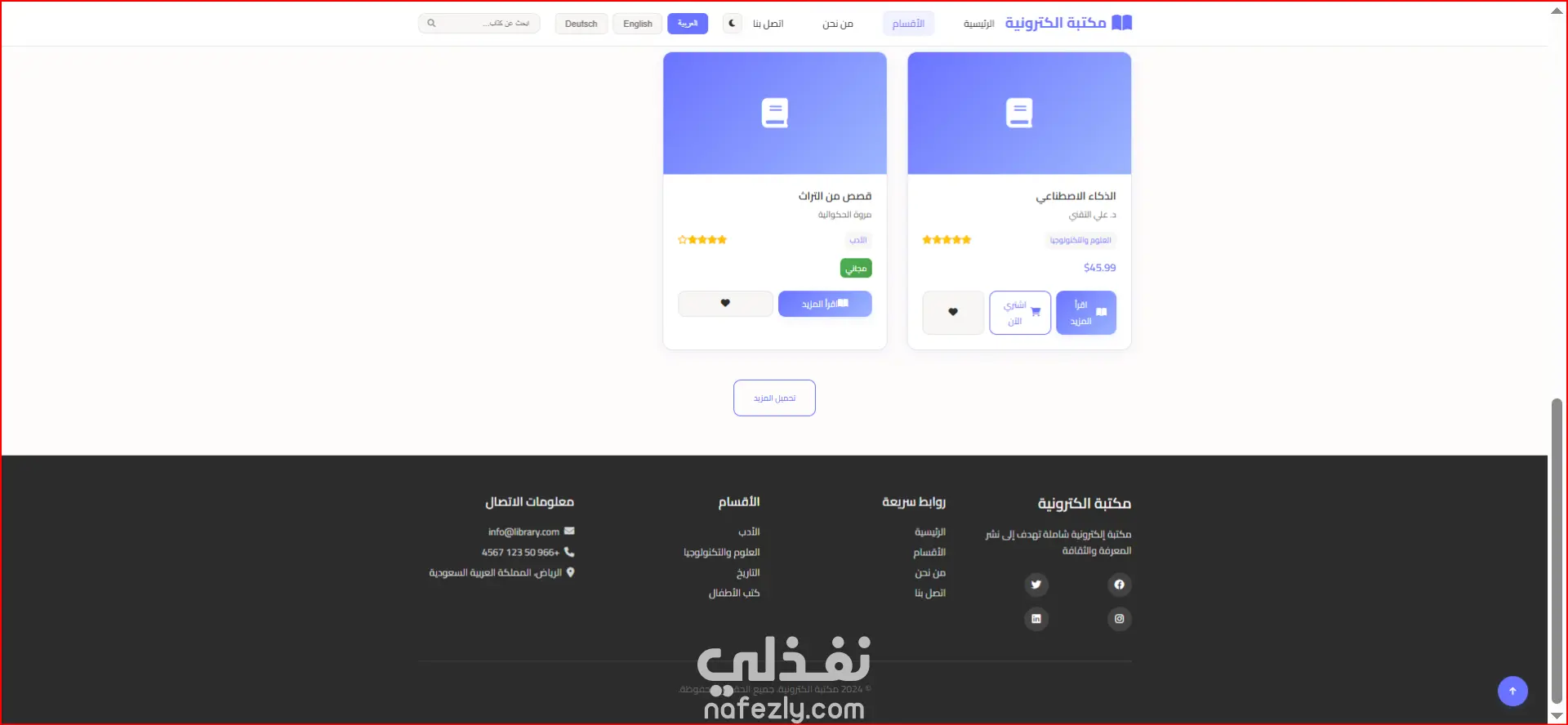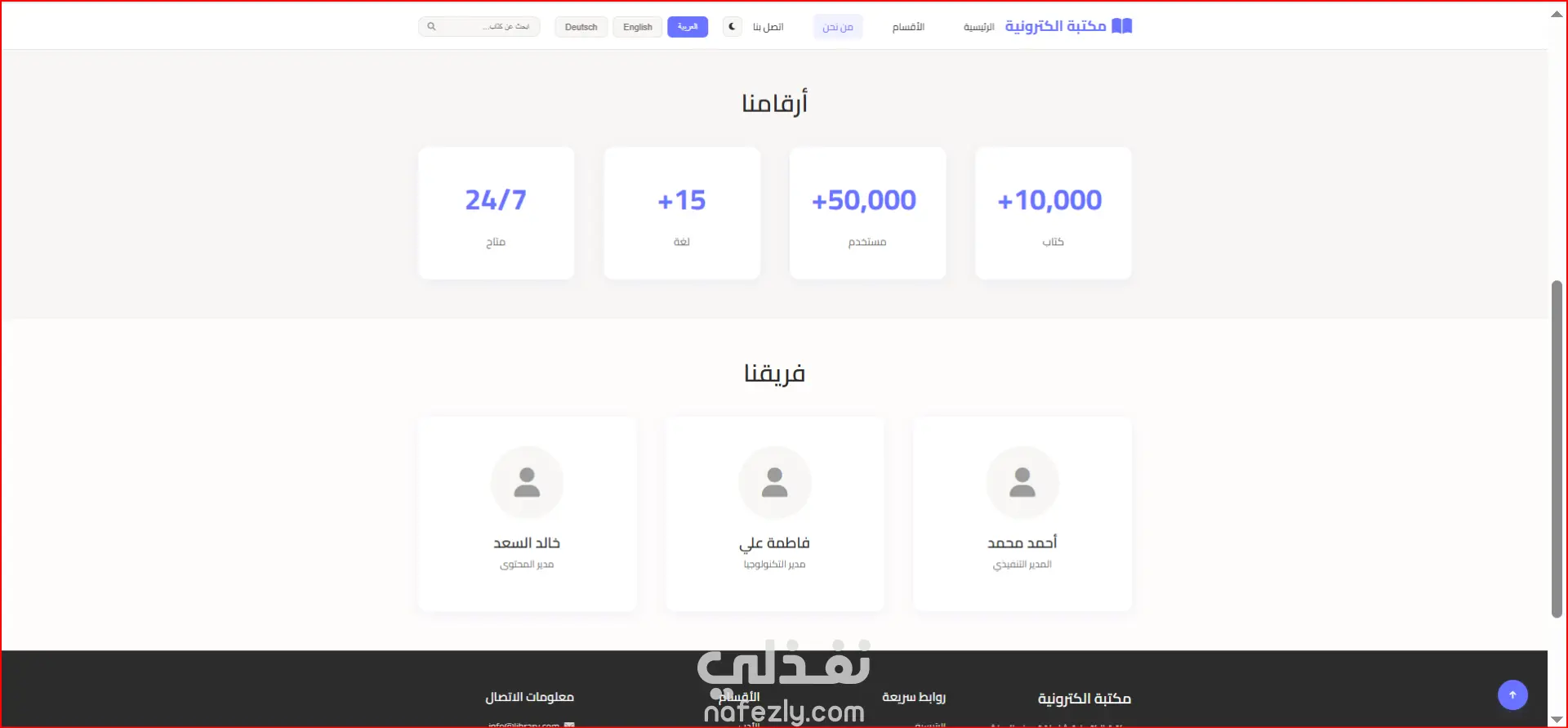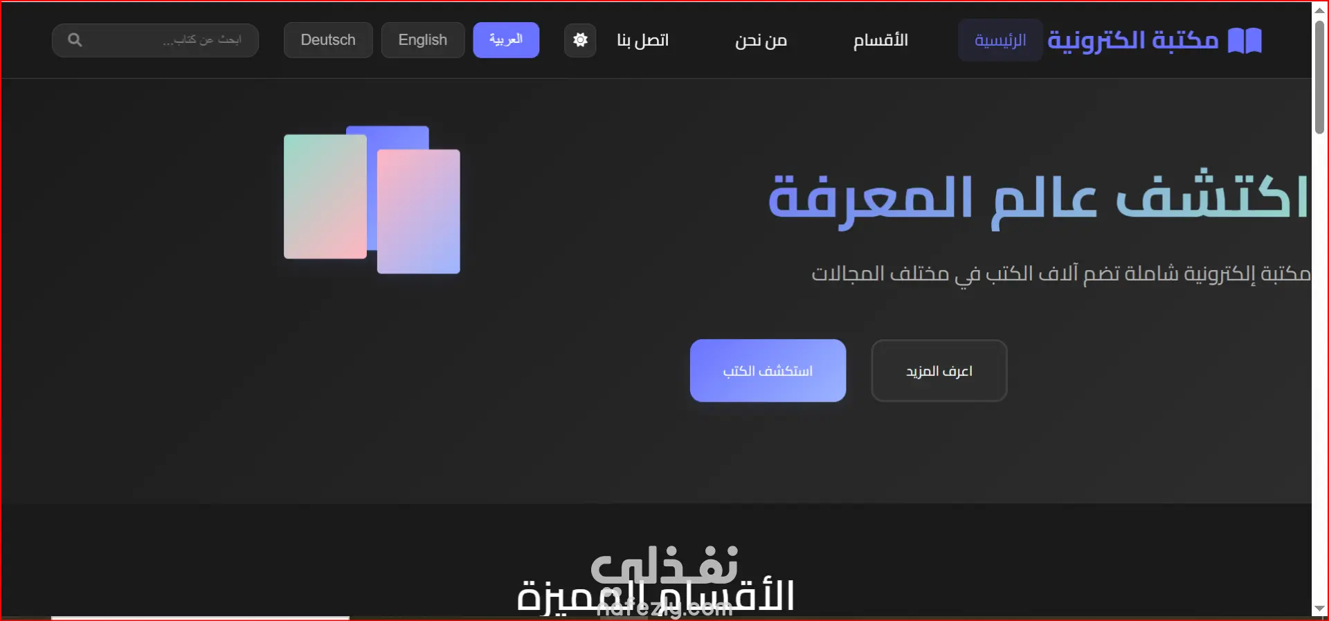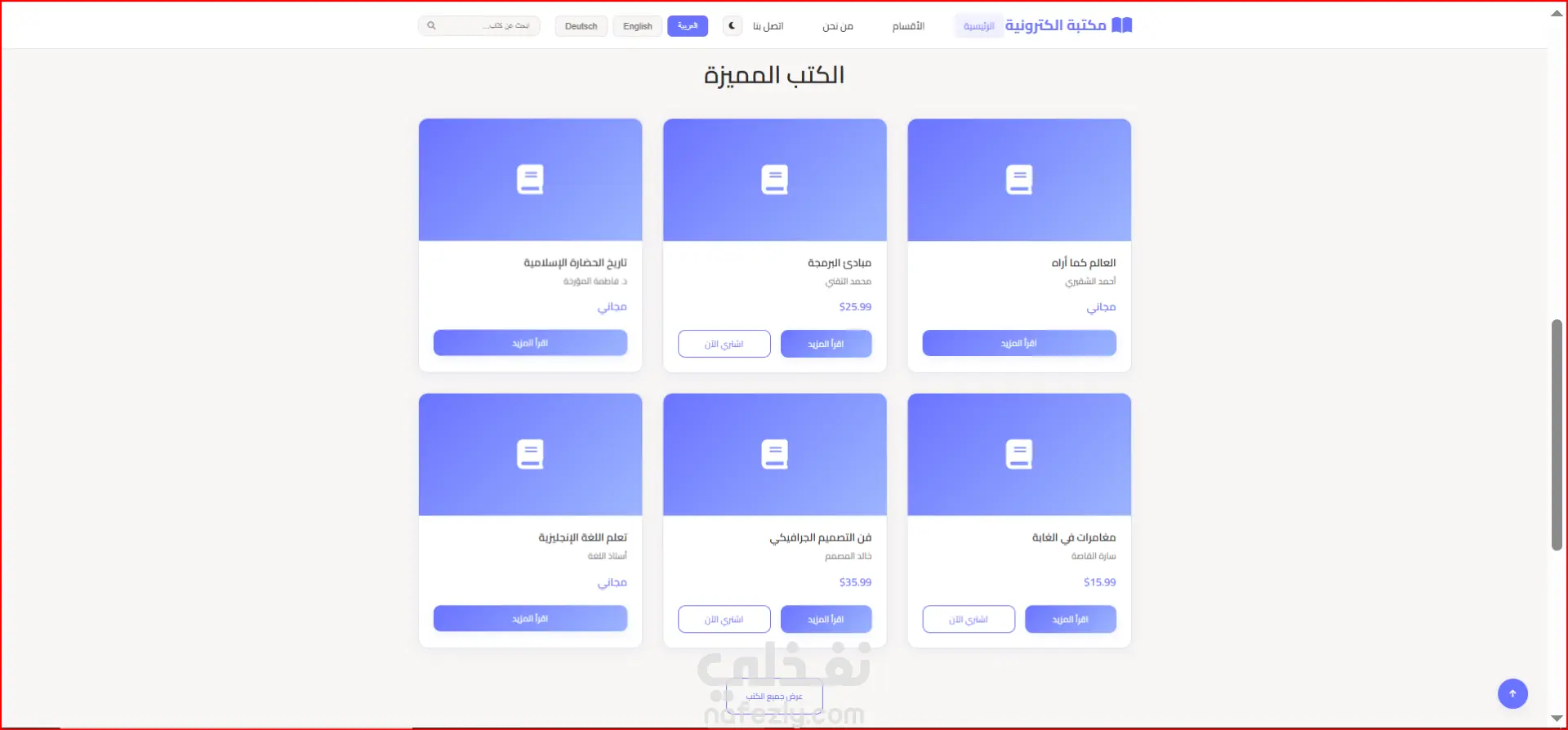 "المكتبة الإلكترونية" هو مشروع موقع ويب يهدف إلى توفير منصة شاملة ومُبتكرة لنشر المعرفة والثقافة. يُقدم الموقع مجموعة واسعة ومتنوعة من الكتب الإلكترونية في مجالات مختلفة لتلبية احتياجات مختلف القراء. مميزات ووظائف الموقع تصميم جذاب وسهل الاستخدام: يتميز الموقع بواجهة مستخدم حديثة وبسيطة، تعتمد على الألوان الهادئة مثل الأبيض والرمادي وتدرجات اللون الأزرق والبنفسجي، مما يمنح تجربة تصفح مريحة. صفحة رئيسية (الرئيسية): تحتوي على قسم ترحيبي بعنوان "اكتشف عالم المعرفة" لتشجيع الزوار على استكشاف المحتوى. تُظهر الأقسام المميزة للمكتبة مثل "كتب الأطفال"، "التاريخ"، "العلوم والتكنولوجيا"، و"الأدب"، مع إحصاءات بعدد الكتب في كل قسم. يوجد أيضًا قسم "الكتب المميزة" لعرض أحدث الكتب أو الأكثر شعبية. صفحة الأقسام (الأقسام): تُتيح تصفح جميع الكتب المُصنفة حسب الأقسام مثل الأدب، العلوم، والتاريخ. يتم عرض كل كتاب في بطاقة منفصلة تحتوي على عنوانه، المؤلف، السعر، وتقييم المستخدمين، مع خيارات لإضافته إلى السلة أو قراءته. صفحة "من نحن": تُقدم لمحة عن قصة تأسيس المكتبة ورسالتها وأهدافها. تُبرز قيم المكتبة مثل الجودة، إتاحة المعرفة للجميع، والابتكار. يُعرض فيها قسم "أرقامنا" الذي يسلط الضوء على الإحصاءات الهامة مثل عدد المستخدمين (أكثر من 50,000)، وعدد الكتب (أكثر من 10,000)، وحالة الخدمة (24/7). يوجد قسم "فريقنا" للتعريف بفريق عمل المشروع. التذييل (Footer): يحتوي على معلومات الاتصال مثل البريد الإلكتروني ورقم الهاتف. يُقدم روابط سريعة للصفحات الرئيسية. يضم أيقونات وسائل التواصل الاجتماعي. يتضمن قسمًا للاشتراك في القائمة البريدية للحصول على آخر التحديثات. دعم متعدد اللغات: يتيح الموقع للزوار الاختيار بين عدة لغات مثل العربية، الإنجليزية، والألمانية، مما يوسع من قاعدة المستخدمين المحتملين. الوضع الليلي (Dark Mode): يتوفر خيار لتغيير وضع العرض إلى الوضع الليلي، وهو ما يُحسن من تجربة القراءة ويقلل إجهاد العين. بشكل عام، المشروع مصمم ليكون منصة متكاملة وسهلة الوصول، تهدف إلى إثراء المحتوى المعرفي وتسهيل عملية الوصول إلى الكتب الإلكترونية لمختلف الفئات.