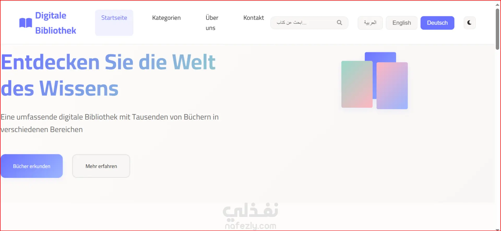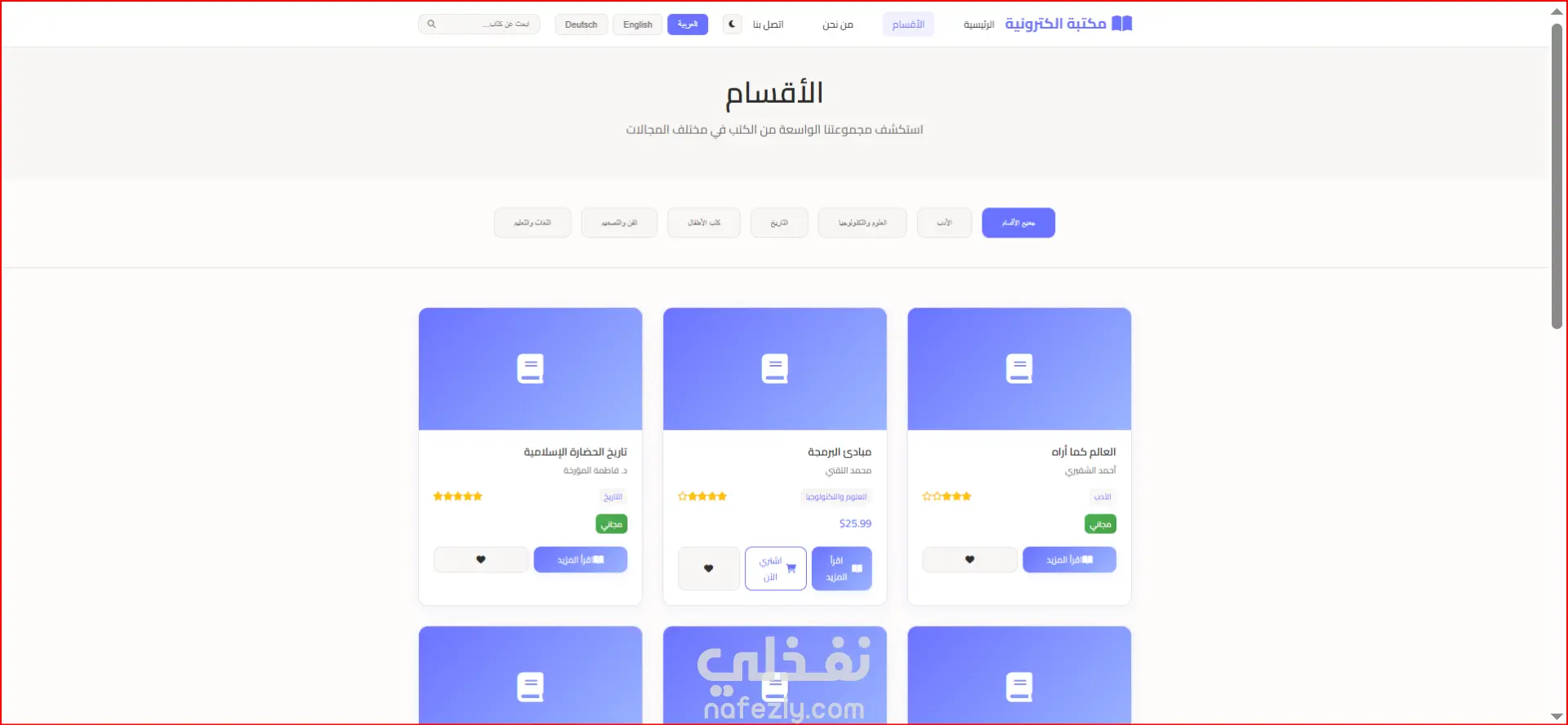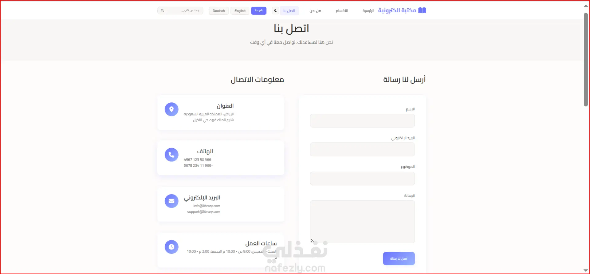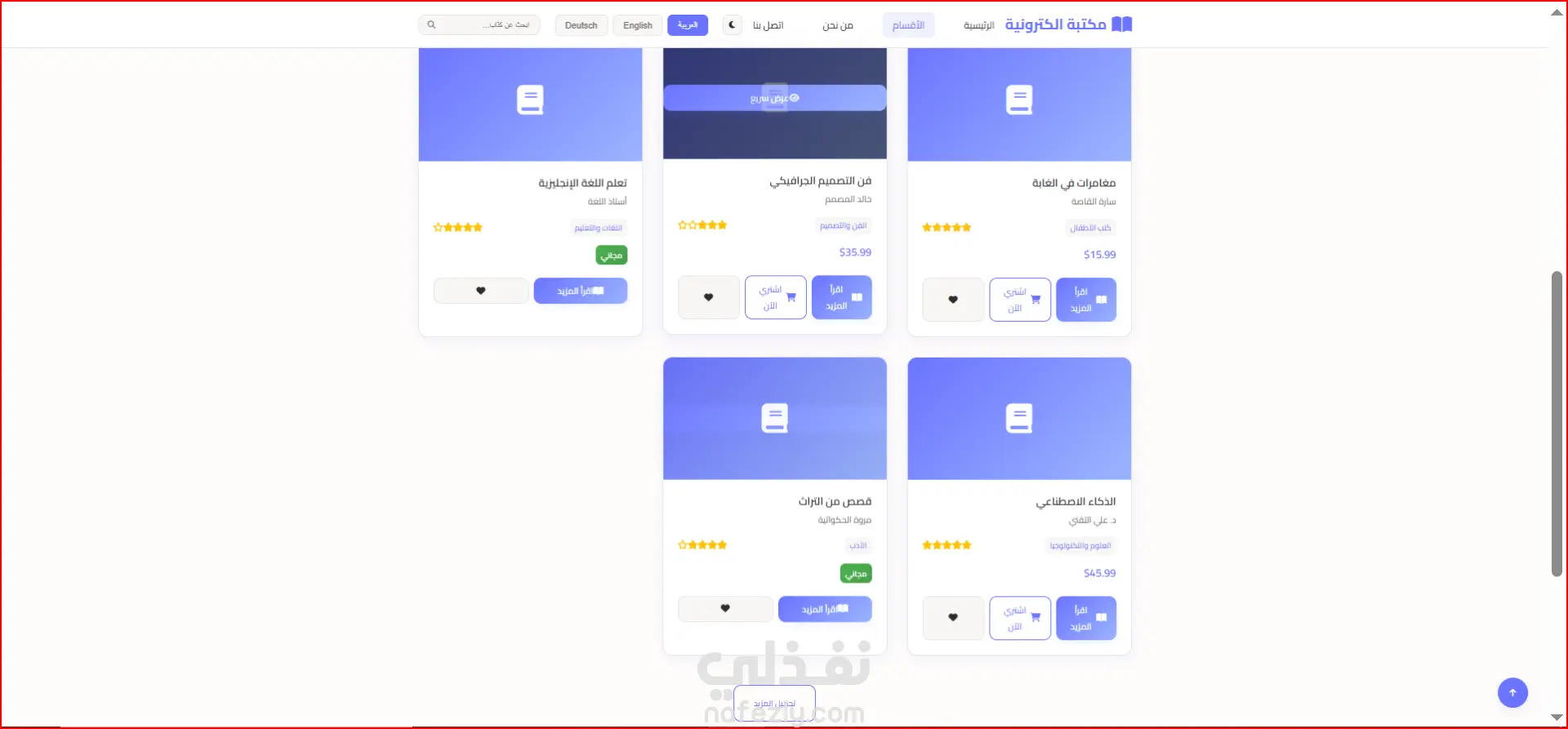 "المكتبة الإلكترونية" هو مشروع موقع ويب يهدف إلى توفير منصة شاملة ومُبتكرة لنشر المعرفة والثقافة. يُقدم الموقع مجموعة واسعة ومتنوعة من الكتب الإلكترونية في مجالات مختلفة لتلبية احتياجات مختلف القراء. مميزات ووظائف الموقع تصميم جذاب وسهل الاستخدام: يتميز الموقع بواجهة مستخدم حديثة وبسيطة، تعتمد على الألوان الهادئة مثل الأبيض والرمادي وتدرجات اللون الأزرق والبنفسجي، مما يمنح تجربة تصفح مريحة. صفحة رئيسية (الرئيسية): تحتوي على قسم ترحيبي بعنوان "اكتشف عالم المعرفة" لتشجيع الزوار على استكشاف المحتوى. تُظهر الأقسام المميزة للمكتبة مثل "كتب الأطفال"، "التاريخ"، "العلوم والتكنولوجيا"، و"الأدب"، مع إحصاءات بعدد الكتب في كل قسم. يوجد أيضًا قسم "الكتب المميزة" لعرض أحدث الكتب أو الأكثر شعبية. صفحة الأقسام (الأقسام): تُتيح تصفح جميع الكتب المُصنفة حسب الأقسام مثل الأدب، العلوم، والتاريخ. يتم عرض كل كتاب في بطاقة منفصلة تحتوي على عنوانه، المؤلف، السعر، وتقييم المستخدمين، مع خيارات لإضافته إلى السلة أو قراءته. صفحة "من نحن": تُقدم لمحة عن قصة تأسيس المكتبة ورسالتها وأهدافها. تُبرز قيم المكتبة مثل الجودة، إتاحة المعرفة للجميع، والابتكار. يُعرض فيها قسم "أرقامنا" الذي يسلط الضوء على الإحصاءات الهامة مثل عدد المستخدمين (أكثر من 50,000)، وعدد الكتب (أكثر من 10,000)، وحالة الخدمة (24/7). يوجد قسم "فريقنا" للتعريف بفريق عمل المشروع. التذييل (Footer): يحتوي على معلومات الاتصال مثل البريد الإلكتروني ورقم الهاتف. يُقدم روابط سريعة للصفحات الرئيسية. يضم أيقونات وسائل التواصل الاجتماعي. يتضمن قسمًا للاشتراك في القائمة البريدية للحصول على آخر التحديثات. دعم متعدد اللغات: يتيح الموقع للزوار الاختيار بين عدة لغات مثل العربية، الإنجليزية، والألمانية، مما يوسع من قاعدة المستخدمين المحتملين. الوضع الليلي (Dark Mode): يتوفر خيار لتغيير وضع العرض إلى الوضع الليلي، وهو ما يُحسن من تجربة القراءة ويقلل إجهاد العين. بشكل عام، المشروع مصمم ليكون منصة متكاملة وسهلة الوصول، تهدف إلى إثراء المحتوى المعرفي وتسهيل عملية الوصول إلى الكتب الإلكترونية لمختلف الفئات.