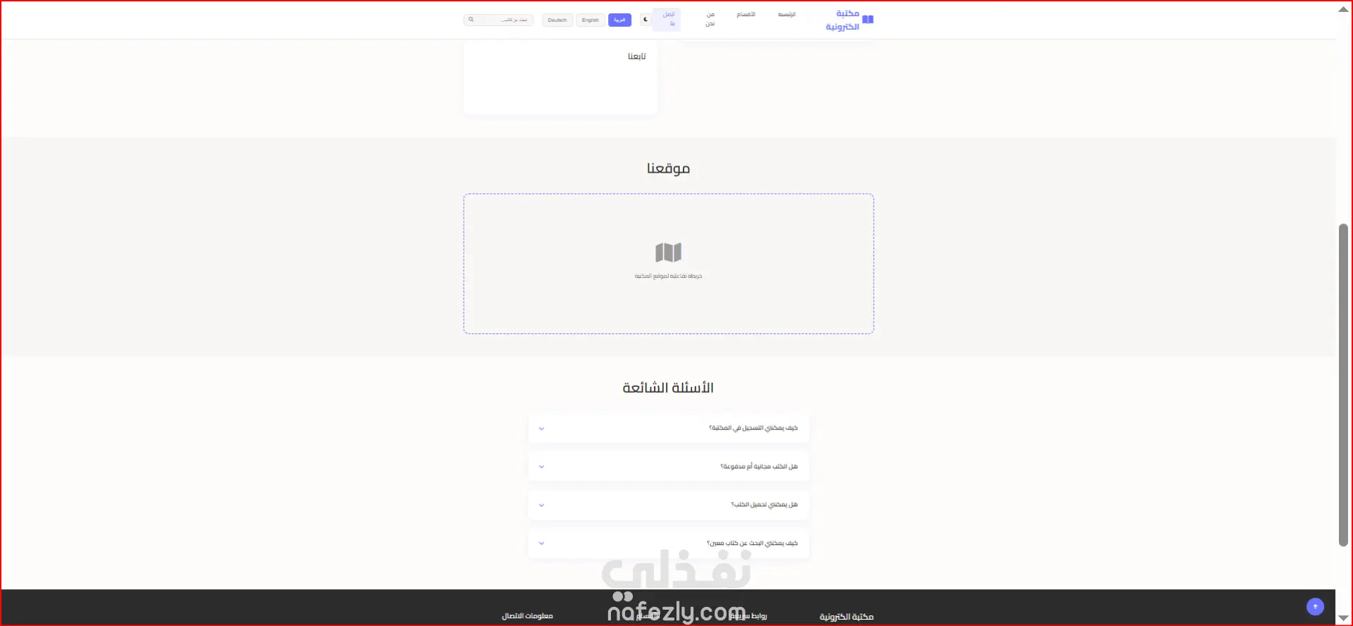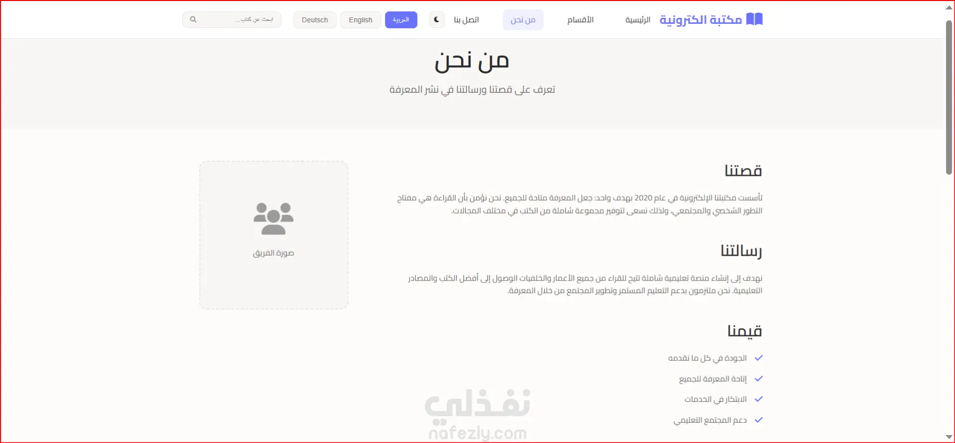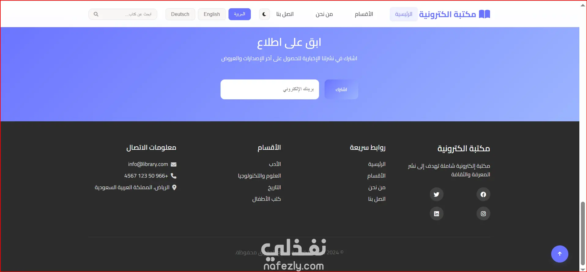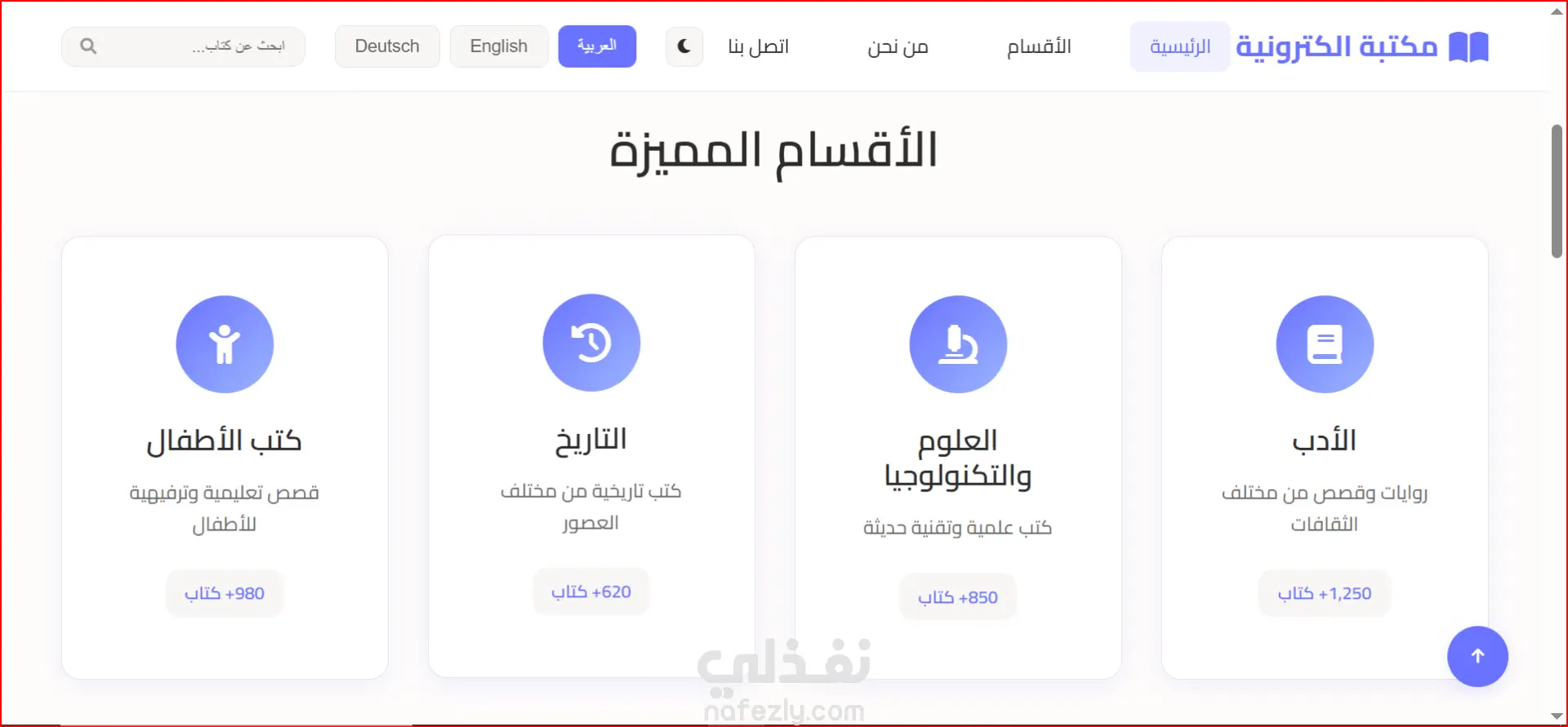 "المكتبة الإلكترونية" هو مشروع موقع ويب يهدف إلى توفير منصة شاملة ومُبتكرة لنشر المعرفة والثقافة. يُقدم الموقع مجموعة واسعة ومتنوعة من الكتب الإلكترونية في مجالات مختلفة لتلبية احتياجات مختلف القراء. مميزات ووظائف الموقع تصميم جذاب وسهل الاستخدام: يتميز الموقع بواجهة مستخدم حديثة وبسيطة، تعتمد على الألوان الهادئة مثل الأبيض والرمادي وتدرجات اللون الأزرق والبنفسجي، مما يمنح تجربة تصفح مريحة. صفحة رئيسية (الرئيسية): تحتوي على قسم ترحيبي بعنوان "اكتشف عالم المعرفة" لتشجيع الزوار على استكشاف المحتوى. تُظهر الأقسام المميزة للمكتبة مثل "كتب الأطفال"، "التاريخ"، "العلوم والتكنولوجيا"، و"الأدب"، مع إحصاءات بعدد الكتب في كل قسم. يوجد أيضًا قسم "الكتب المميزة" لعرض أحدث الكتب أو الأكثر شعبية. صفحة الأقسام (الأقسام): تُتيح تصفح جميع الكتب المُصنفة حسب الأقسام مثل الأدب، العلوم، والتاريخ. يتم عرض كل كتاب في بطاقة منفصلة تحتوي على عنوانه، المؤلف، السعر، وتقييم المستخدمين، مع خيارات لإضافته إلى السلة أو قراءته. صفحة "من نحن": تُقدم لمحة عن قصة تأسيس المكتبة ورسالتها وأهدافها. تُبرز قيم المكتبة مثل الجودة، إتاحة المعرفة للجميع، والابتكار. يُعرض فيها قسم "أرقامنا" الذي يسلط الضوء على الإحصاءات الهامة مثل عدد المستخدمين (أكثر من 50,000)، وعدد الكتب (أكثر من 10,000)، وحالة الخدمة (24/7). يوجد قسم "فريقنا" للتعريف بفريق عمل المشروع. التذييل (Footer): يحتوي على معلومات الاتصال مثل البريد الإلكتروني ورقم الهاتف. يُقدم روابط سريعة للصفحات الرئيسية. يضم أيقونات وسائل التواصل الاجتماعي. يتضمن قسمًا للاشتراك في القائمة البريدية للحصول على آخر التحديثات. دعم متعدد اللغات: يتيح الموقع للزوار الاختيار بين عدة لغات مثل العربية، الإنجليزية، والألمانية، مما يوسع من قاعدة المستخدمين المحتملين. الوضع الليلي (Dark Mode): يتوفر خيار لتغيير وضع العرض إلى الوضع الليلي، وهو ما يُحسن من تجربة القراءة ويقلل إجهاد العين. بشكل عام، المشروع مصمم ليكون منصة متكاملة وسهلة الوصول، تهدف إلى إثراء المحتوى المعرفي وتسهيل عملية الوصول إلى الكتب الإلكترونية لمختلف الفئات.