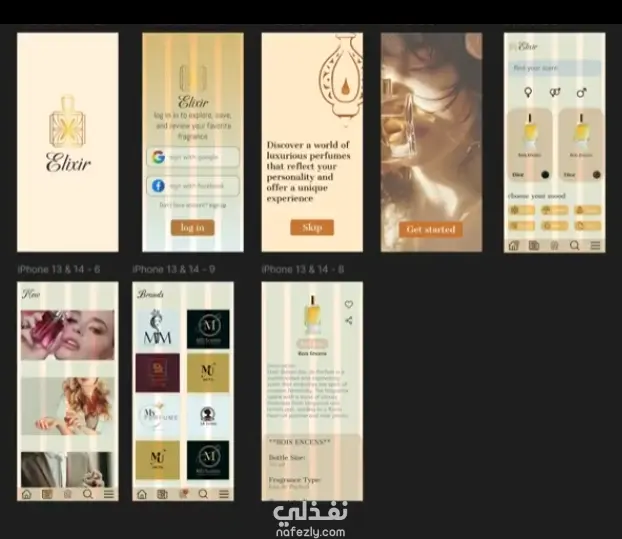 تطبيق موبايل لتصفح وشراء العطور بسهولة. التصميم بيعتمد على واجهة بسيطة وأنيقة تعكس هوية العلامة التجارية الفاخرة.
