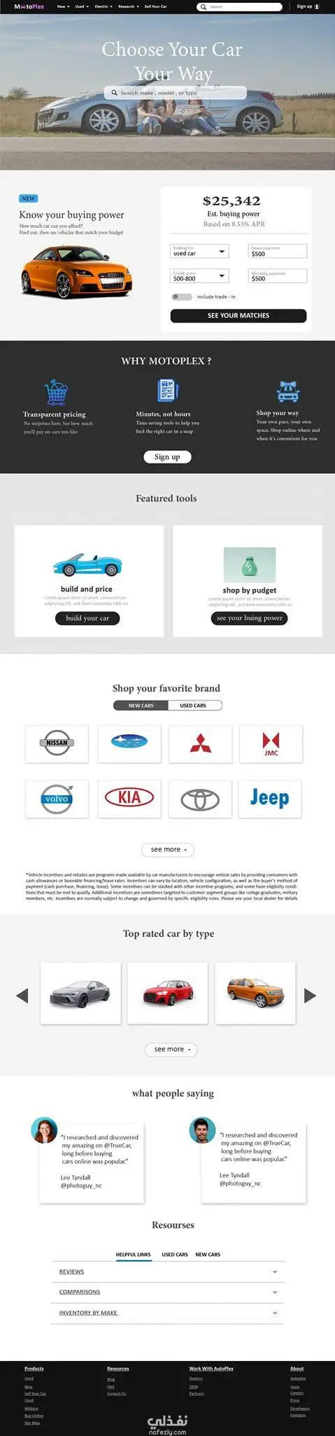 موقع إلكتروني حديث لعرض وشراء السيارات أونلاين، يركز على التنظيم البصري وسهولة التنقل.