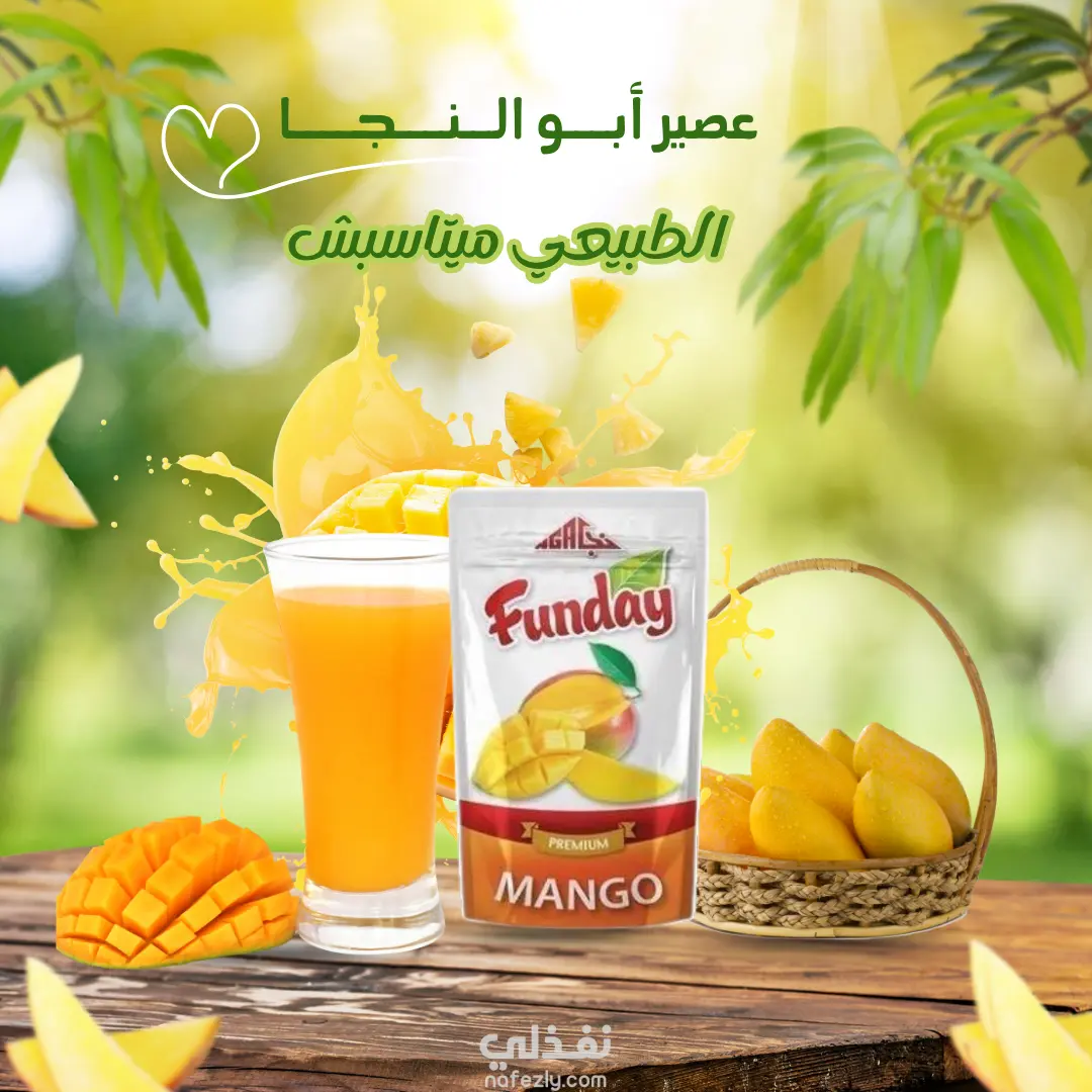 تصميم سوشيال ميديا لمصنع عصير ابو النجا التصميم يحتوي علي الوان اللوجو ابو النجا مع عبوة من العصير وكوباية من العصير الفريش مع خلفية من الطبيعة وقطع المانجو
