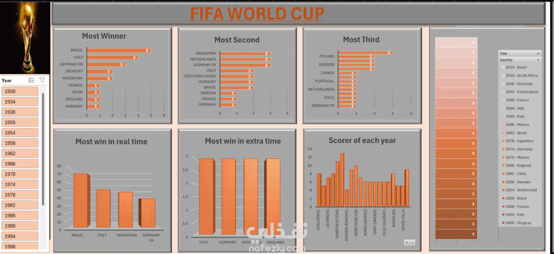 FIFA World Cup An interactive dashboard built to analyze FIFA players’ statistics, providing insights into player performance, team comparisons, and overall trends in the dataset. Used Tools : Excel Power query Power pivot