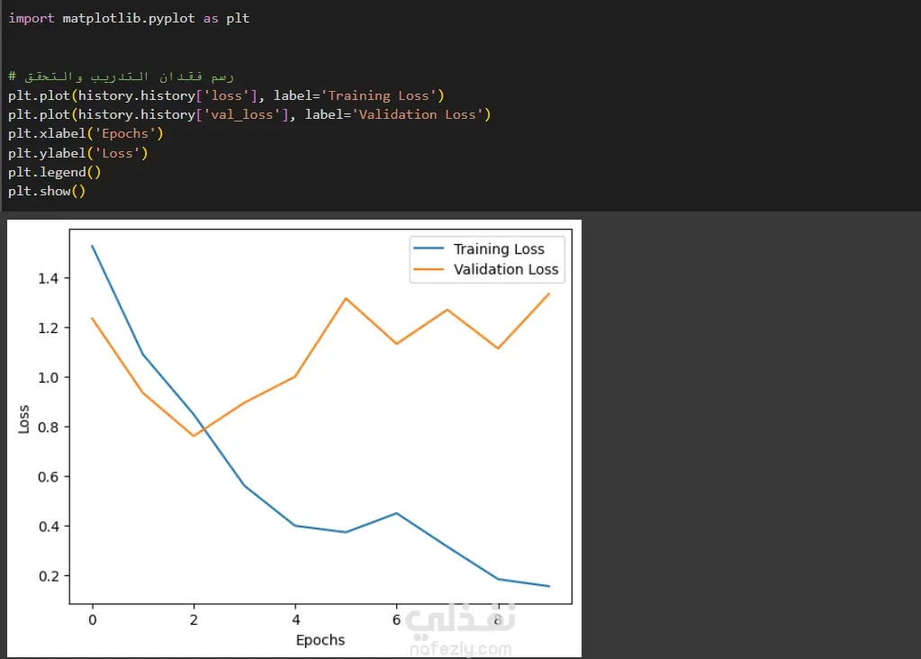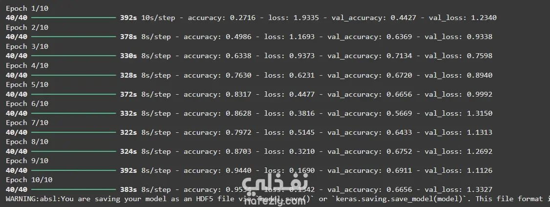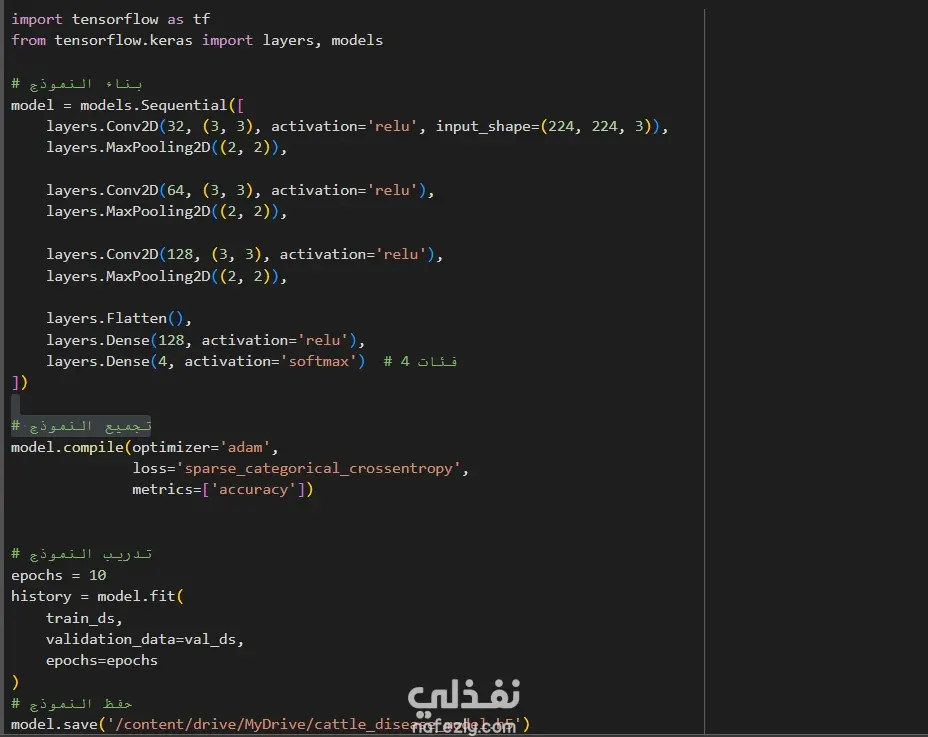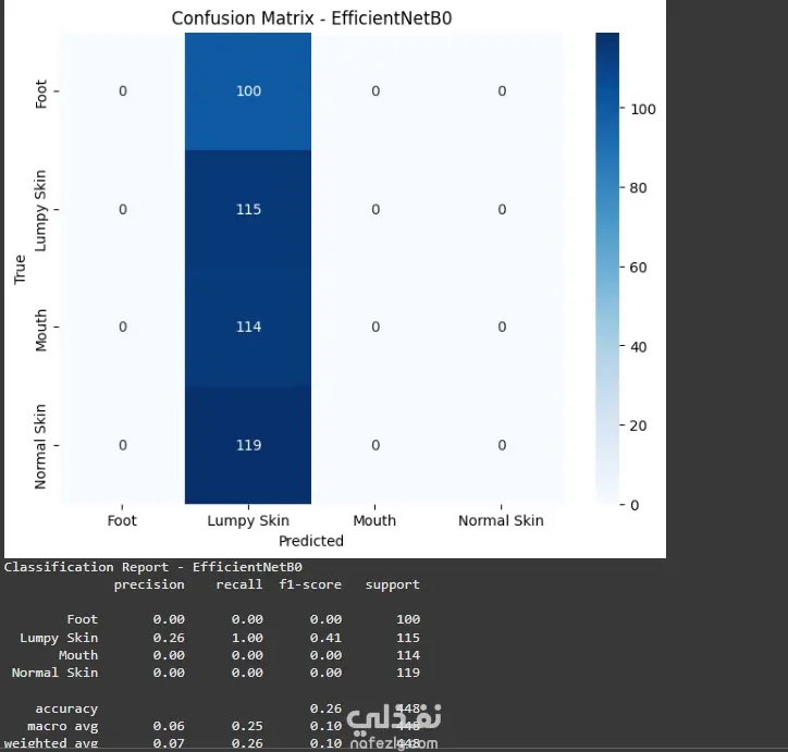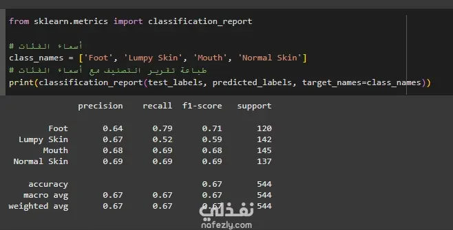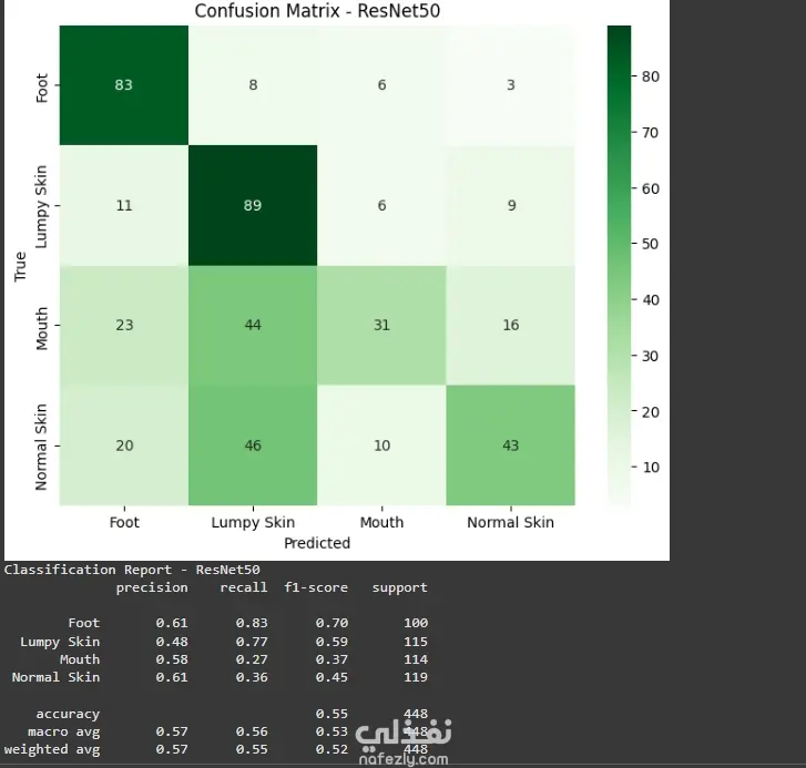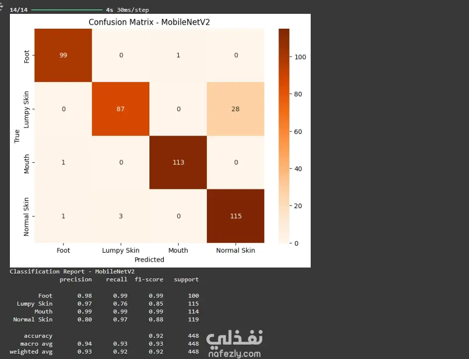 تم تدريب النموذج باستخدام تقنيات Transfer Learning على قاعدة بيانات تشمل 4 فئات: مرض القدم، الجلد العقدي، أمراض الفم، والجلد السليم.