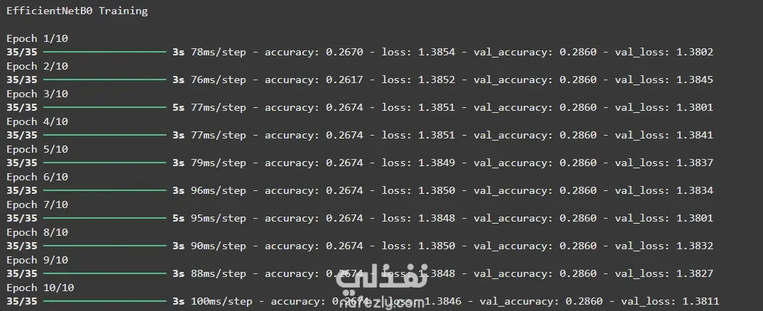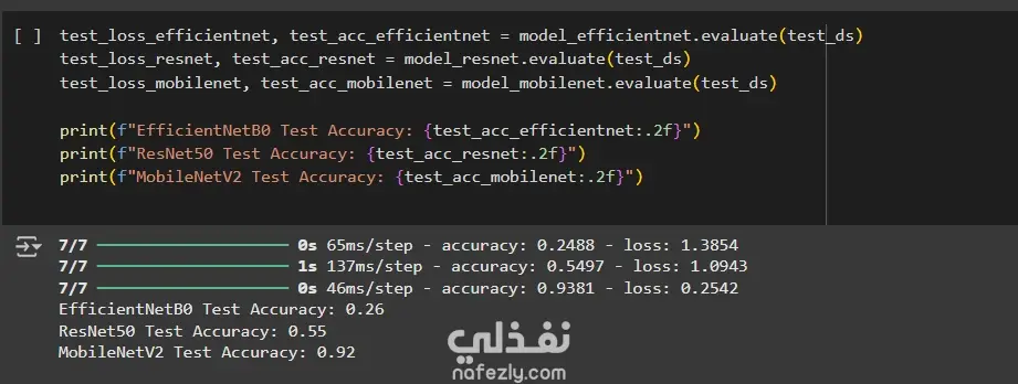 استخدمت عدة نماذج مثل MobileNetV2 (الأفضل والأسرع بدقة ~92%)، بالإضافة إلى EfficientNetB0 وResNet50 للمقارنة.