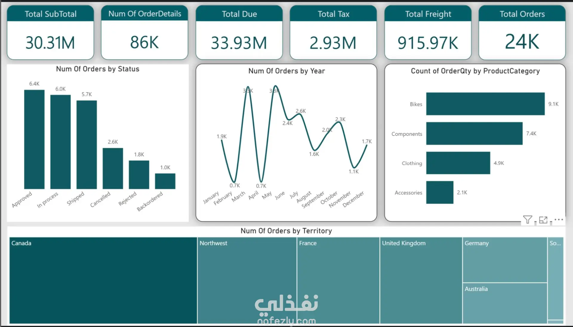 عدد الطلبات حسب المنطقة (Num Of Orders by Territory): مخطط شجري (Treemap) يوضح توزيع الطلبات على المناطق الجغرافية المختلفة، حيث يمثل حجم كل مستطيل حصة المنطقة من إجمالي الطلبات.