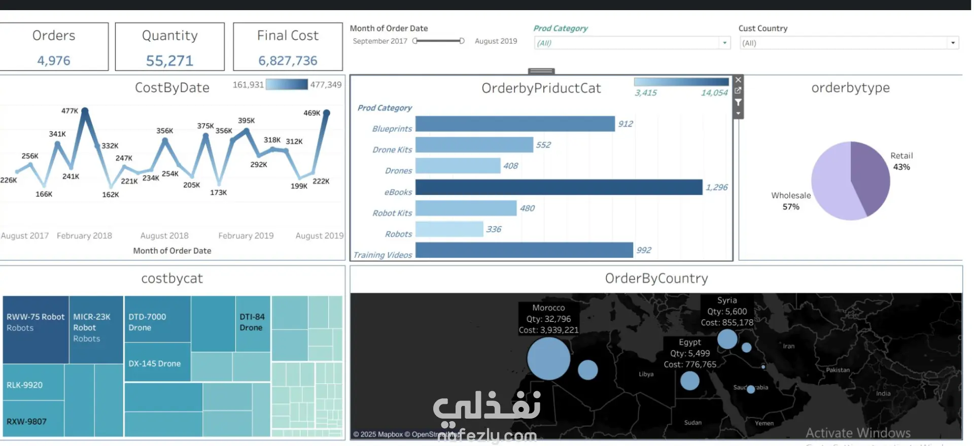 كمية الطلبات حسب فئة المنتج (Count of OrderQty by ProductCategory): يوضح أي فئات المنتجات هي الأكثر مبيعاً من حيث الكمية.