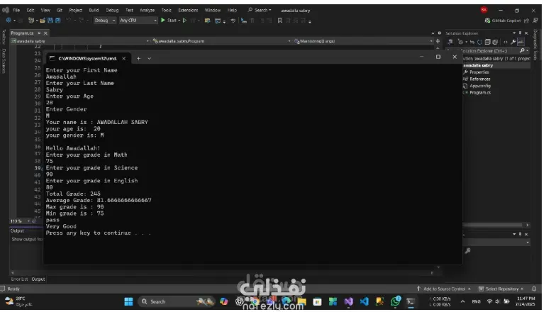 عمل بيدخل اسم الطالب والعمر والمواد وبيحسب متوسط درجات المواد ب c#