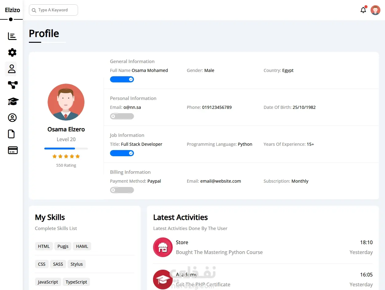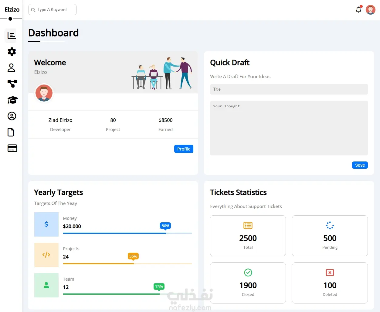 موقع Dashboard يعرض به 8 صفح مواقع (الواجه الاساسية و الصفحة الشخصية و الاعدادات و التدريبات و الخدمات و الفيلات و غيرها ) و تم استخدام HTML و CSS و JS الموقع متوافق مع الهواتف و الكمبيوتر