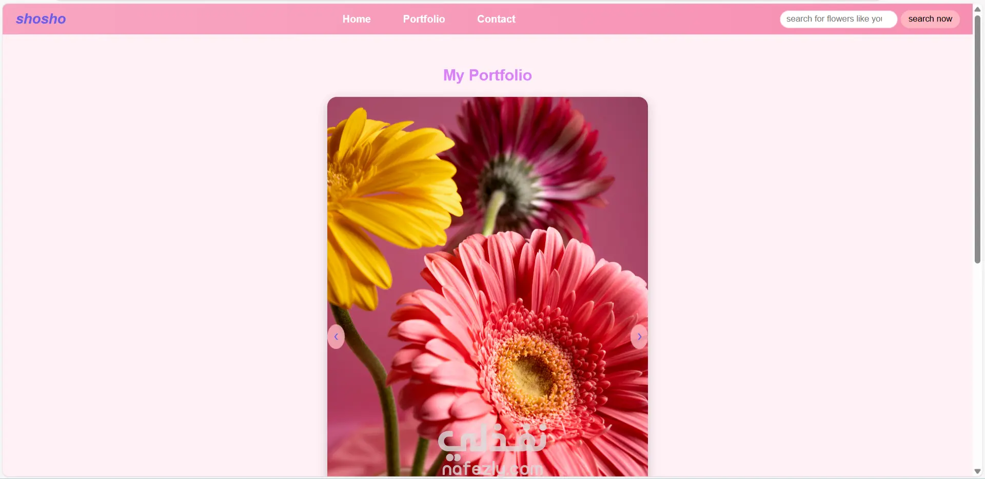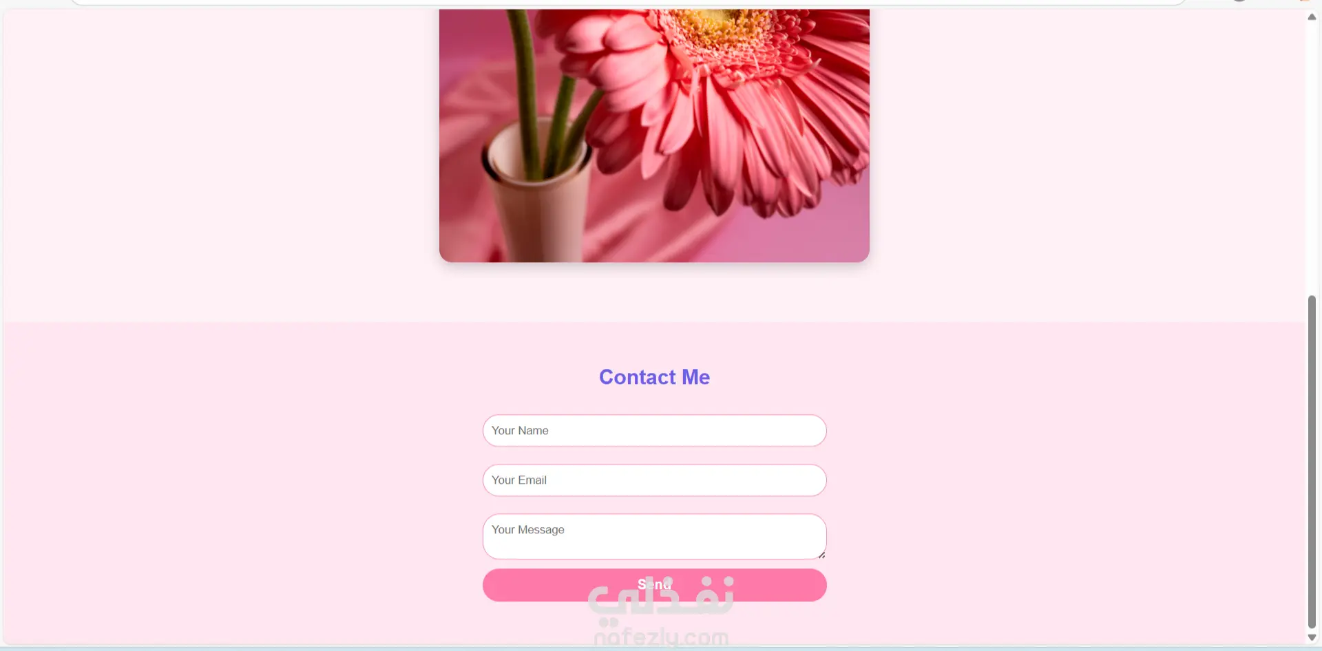 الصفحة تحتوي على سلايدر ديناميكي يعرض مجموعة من صور الورود بشكل متتابع وجذّاب، مع تأثيرات انتقال سلسةو جزء للتواصل.