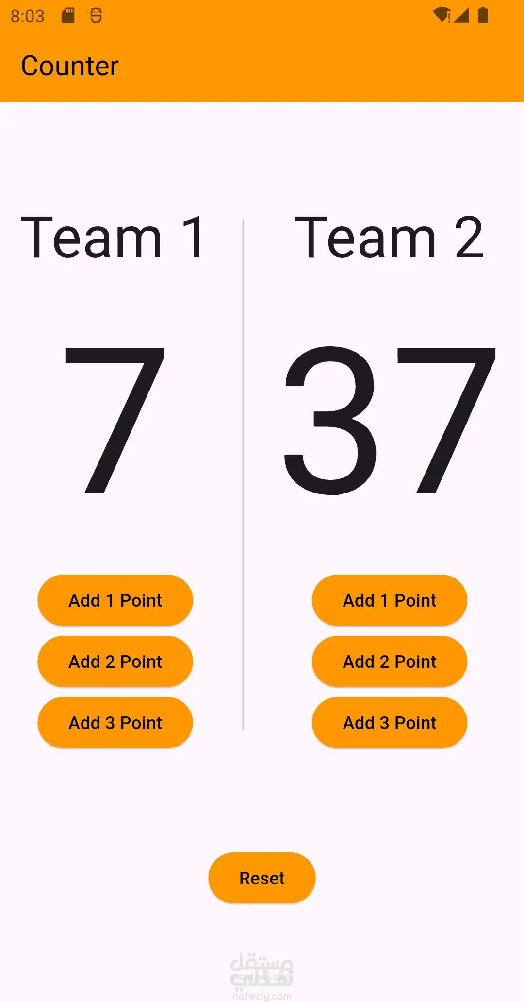 كما يحتوي التطبيق على زر Reset لإعادة تعيين العداد إلى الصفر فورًا، مما يتيح بدء مباراة جديدة أو إعادة الحساب من البداية دون الحاجة لتعديلات يدوية.