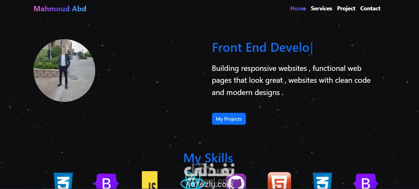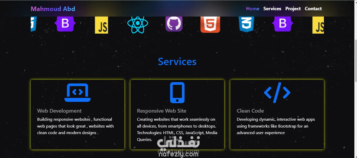 صحفة لعرض اعمالي الشخصية والخدمات التي استطيع ان اقدمها وهي عبارة عن تعريف عن نفسي و صفحة خدمات وصفحة للمشاريع و footer وهو ايضا responsive page