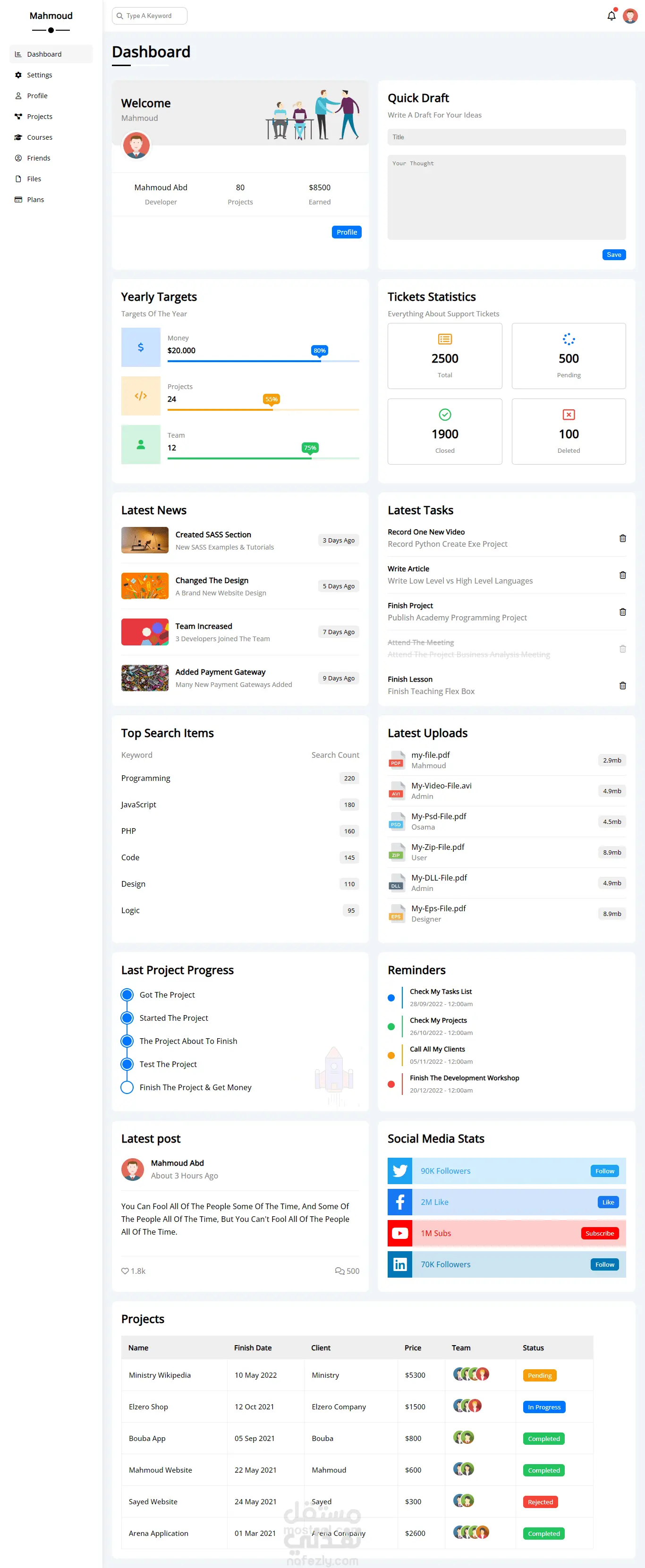 موقع كامل dashboard يوجد العديد من صفحات ال html مدمجه في صفحة واحدة وهي لتسهيل العمل علي الموقع اولا وهو جزء التعريفي ومن ثم الاعمال المنجَزة واعضاء الفريق ووظائف كل مبرمج شارك ف الصفحة واخيرا ال footer وهو الحزء الهاص بلينكات المبرمج تم تصميم العمل html , css, javascript مصمم لجميع انواع الشاشات