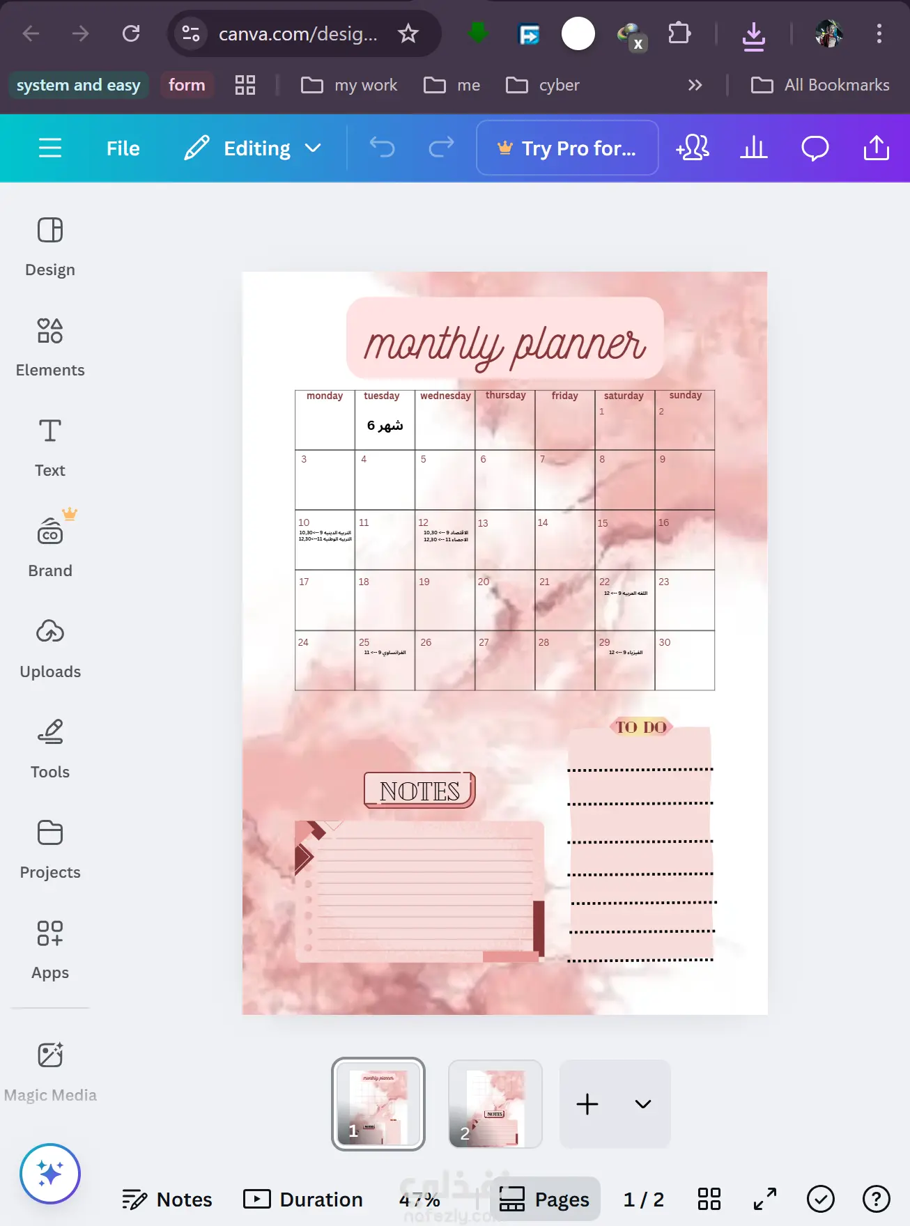 design for monthly planner with notes and to do list , used only canva , by my creativity