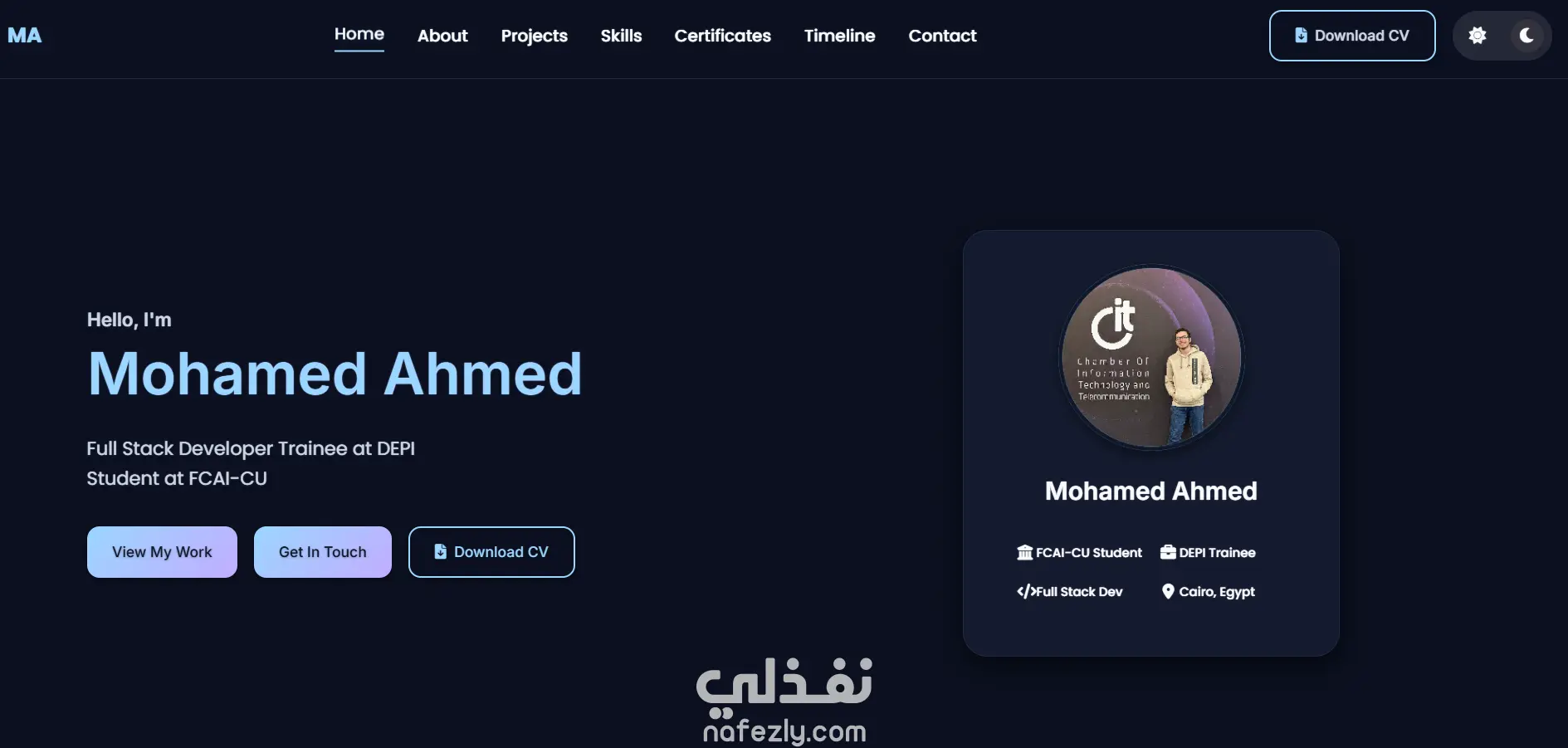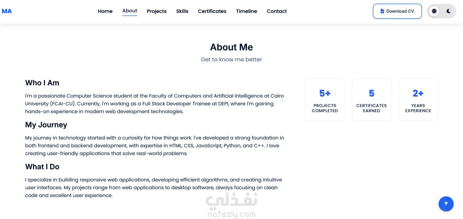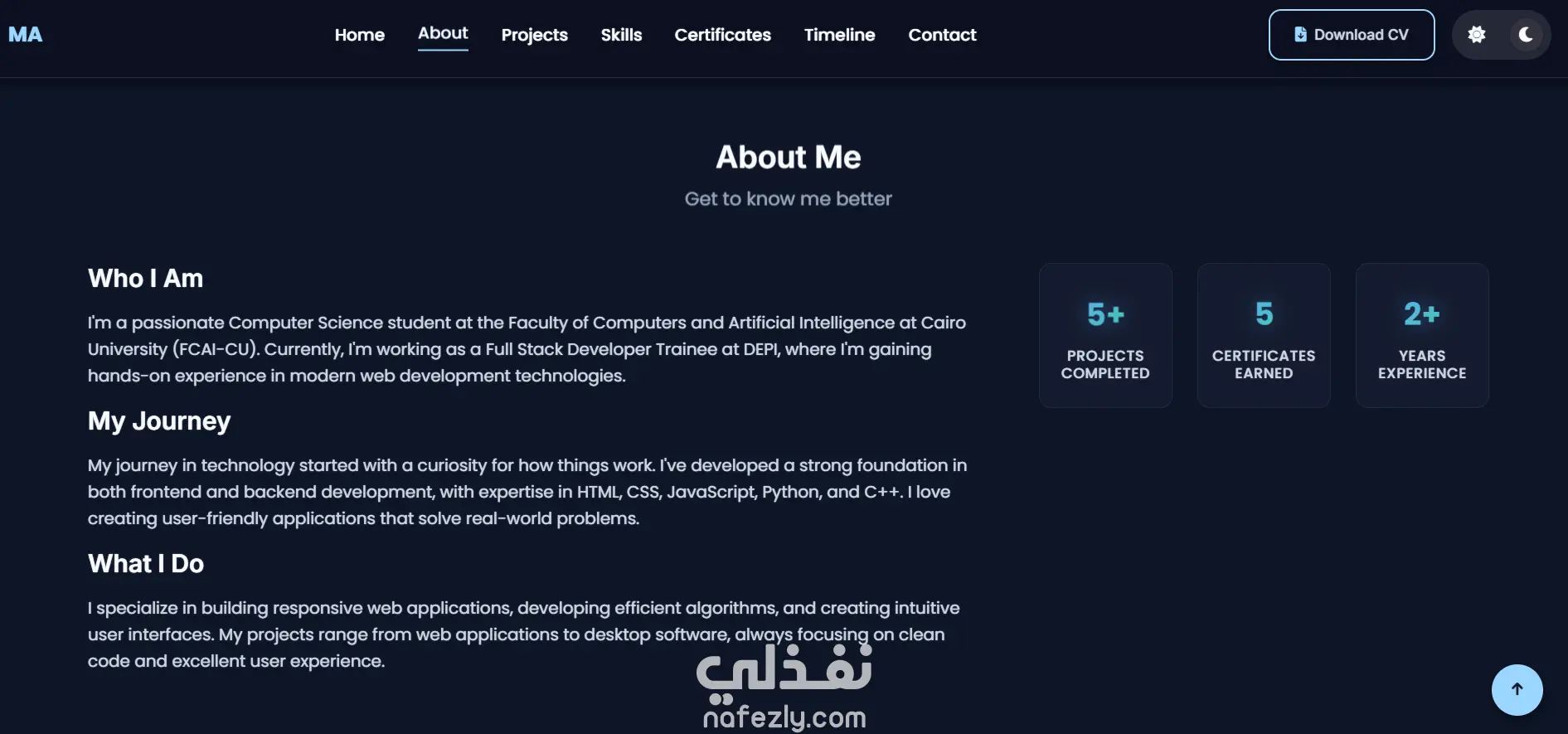 قمت بتطوير موقع بورتفوليو شخصي حديث ومتجاوب لعرض مهاراتي كمطور Full Stack Trainee وطالب علوم حاسب، يتميز بتصميم عصري وسلس يدعم الوضعين الفاتح والداكن، مع واجهة مستخدم تفاعلية تحتوي على أنيميشن ناعم وخط زمني ديناميكي لعرض الخبرات. الموقع يحتوي على نموذج تواصل مدمج باستخدام EmailJS لإرسال الإشعارات لكل من المستخدم والمدير، بالإضافة إلى ميزة تحميل السيرة الذاتية بتجربة استخدام محسّنة. تم تحسين الأداء لتحقيق نتائج تفوق 95 في اختبار Lighthouse من حيث السرعة، والأداء، وتجربة المستخدم، وتمت مراعاة قواعد SEO لضمان الظهور في محركات البحث. استخدمت في بناء المشروع تقنيات HTML5 وCSS3 وJavaScript (ES6+) إلى جانب Font Awesome وGoogle Fonts، وتم نشره على منصة Vercel لتحقيق أداء سريع وثابت. هذا العمل يعكس مهارتي في تطوير واجهات أمامية احترافية تجمع بين الجمال، السرعة، وسهولة الاستخدام.
