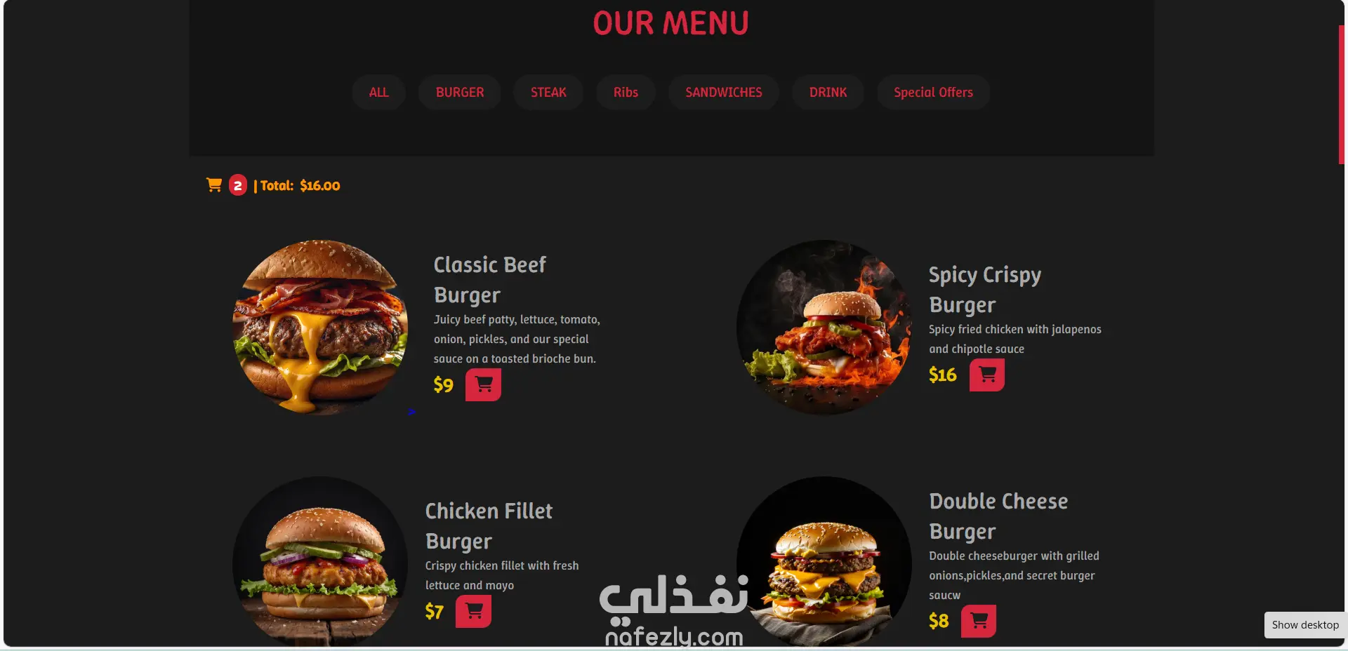 الصفحة تحتوي على أقسام مختلفة مثل Burgers – Appetizers – Sandwiches مع إمكانية الانتقال بين الأقسام بسهولة.